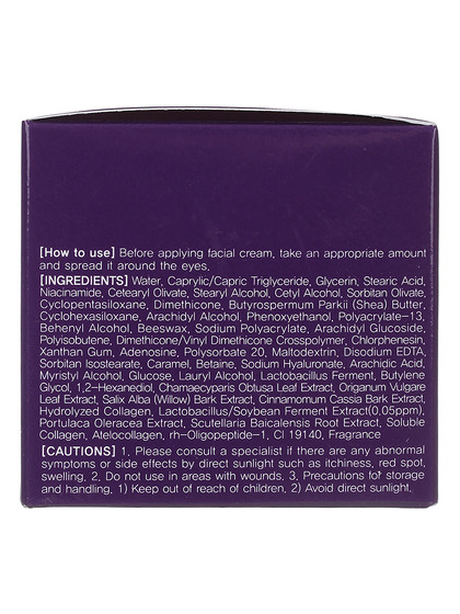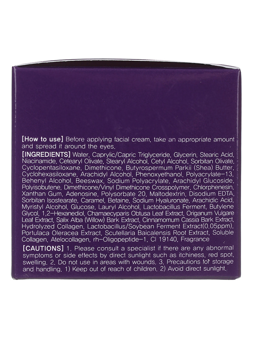 Water, Caprylic/Capric Triglyceride, Glycerin, Stearic Acid, Niacinamide, Cetearyl Olivate, Stearyl Alcohol, Cetyl Alcohol, Sorbitan Olivate, Cyclopentasiloxane, Dimethicone, Butyrospermum Parkii (Shea) Butter, Cyclohexasiloxane, Arachidyl Alcohol, Phenoxyethanol, Polyacrylate-13, Behenyl Alcohol, Beeswax, Sodium Polyacrylate, Arachidyl Glucoside, Polyisobutene, Dimethicone/Vinyl Dimethicone Crosspolymer, Chlorphenesin, Xanthan Gum, Adenosine, Polysorbate 20, Maltodextrin, Disodium EDTA, Sorbitan Isostearate, Caramel, Betaine, Sodium Hyaluronate, Arachidic Acid, Myristyl Alcohol, Glucose, Lauryl Alcohol, Lactobacillus Ferment, Butylene Glycol, 1,2-Hexanediol, Chamaecyparis Obtusa Leaf Extract, Origanum Vulgare Leaf Extract, Salix Alba (Willow) Bark Extract, Cinnamomum Cassia Bark Extract, Hydrolyzed Collagen, Lactobacillus/Soybean Ferment Extract(0.05ppm), Portulaca Oleracea Extract, Scutellaria Baicalensis Root Extract, Soluble Collagen, Atelocollagen, rh-Oligopeptide-1, CI 19140, Fragrance