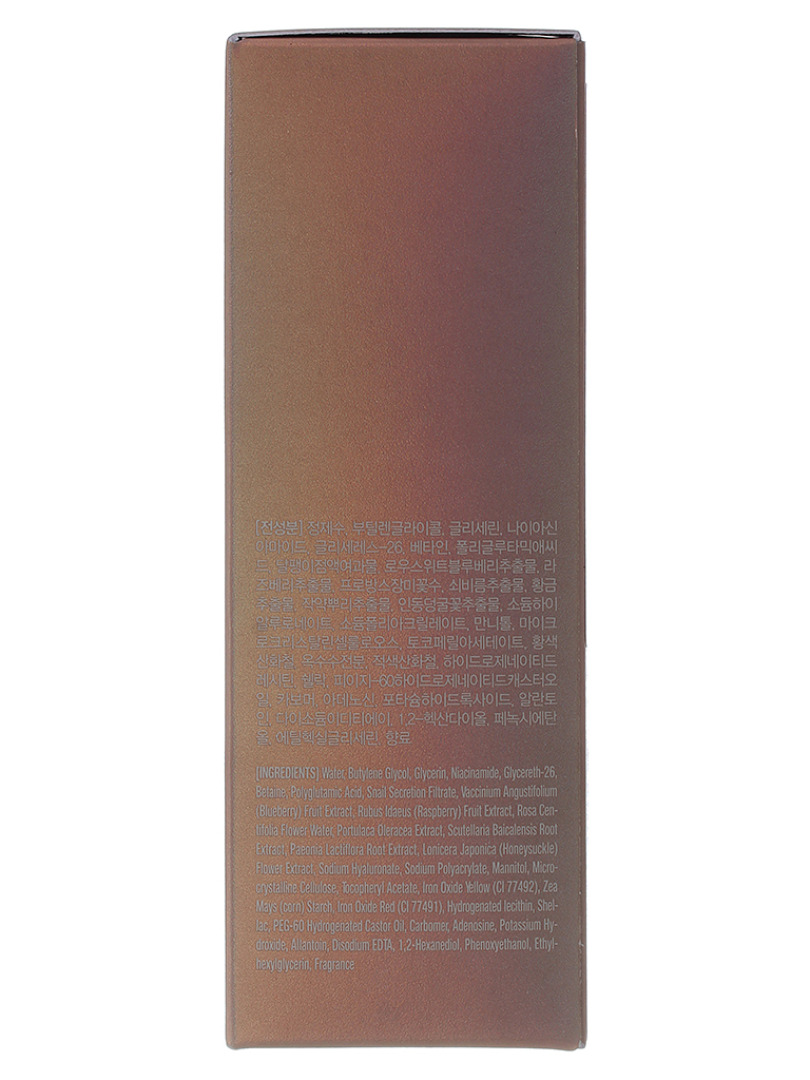 Water, Butylene Glycol, Glycerin, Niacinamide, Glycereth-26, Betaine, Polyglutamic Acid, Snail Secretion Filtrate, Vaccinium Angustifolium (Blueberry) Fruit Extract, Rubus Idaeus(Raspberry) Fruit Extract, Rosa Centifolia Flower Water, Portulaca Oleracea Extract, Scutellaria Baicalensis Root Extract, Paeonia Lactiflora Root Extract, Lonicera Japonica (Honeysuckle) Flower Extract, Sodium Hyaluronate, Sodium Polyacrylate, Mannitol, Microcrystalline Cellulose, Tocopheryl Acetate, Iron Oxide Yellow (CI 77492), Zea Mays (corn) Starch, Iron Oxide Red (CI 77491), Hydrogenated lecithin, Shellac, PEG-60 Hydrogenated Castor Oil, Carbomer, Adenosine, Potassium Hydroxide, Allantoin, Disodium EDTA, 1,2-Hexanediol, Phenoxyethanol, Ethylhexylglycerin, Fragrance