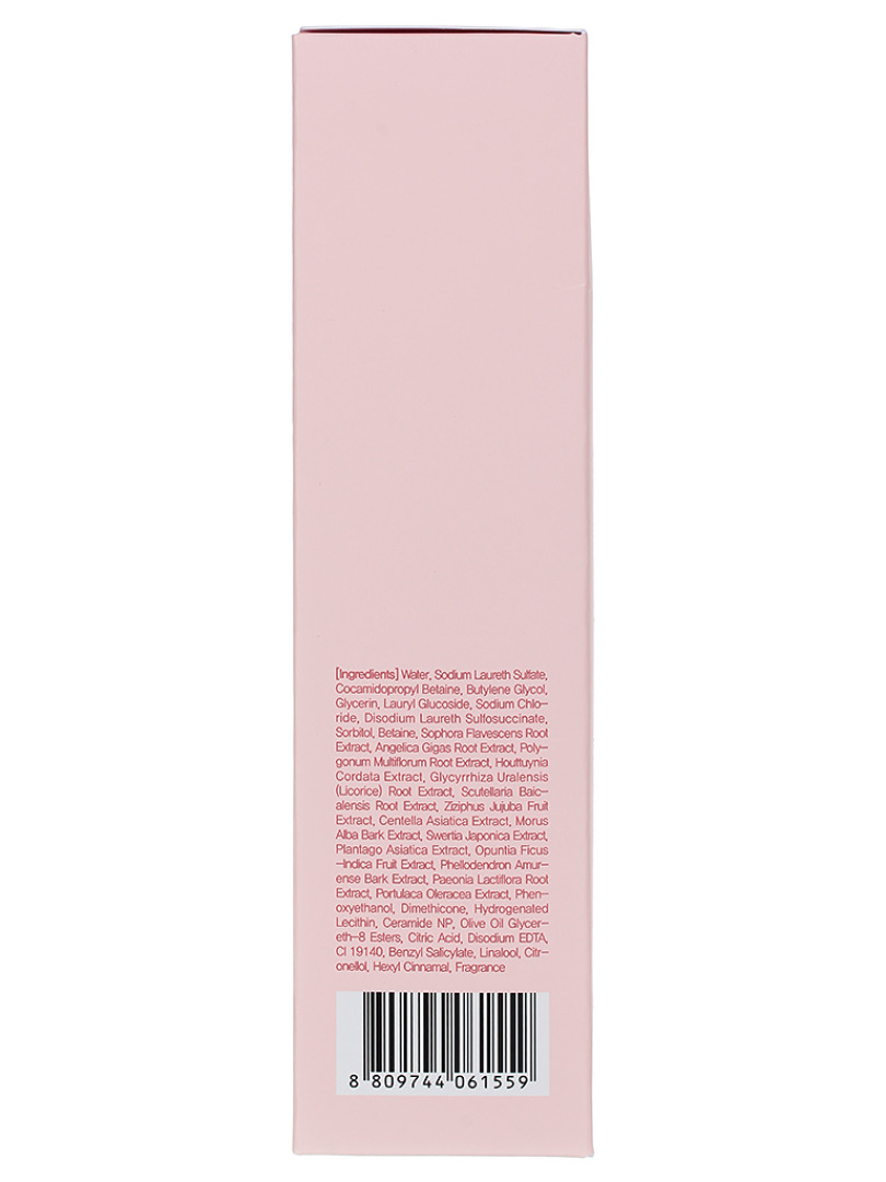 Water, Sodium Laureth Sulfate, Cocamidopropyl Betaine, Butylene Glycol, Glycerin, Lauryl Glucoside, Sodium Chloride, Disodium Laureth Sulfosuccinate, Sorbitol, Betaine, Sophora Flavescens Root Extract, Scutellaria Baicalensis Root Extract, Polygonum Multiflorum Root Extract, Houttuynia Cordata Extract, Glycyrrhiza Uralensis (Licorice) Root Extract, Centella Asiatica Extract, Angelica Gigas Root Extract, Swertia Japonica Extract, Portulaca Oleracea Extract, Plantago Asiatica Extract, Phellodendron Amurense Bark Extract, Paeonia Lactiflora Root Extract, Opuntia Ficus-Indica Fruit Extract, Morus Alba Bark Extract, Phenoxyethanol, Dimethicone, Hydrogenated Lecithin, Ceramide NP, Olive Oil Glycereth-8 Esters, Citric Acid, Disodium EDTA, CI 19140, Fragrance (Benzyl Salicylate, Citronellol, Hexyl Cinnamal)