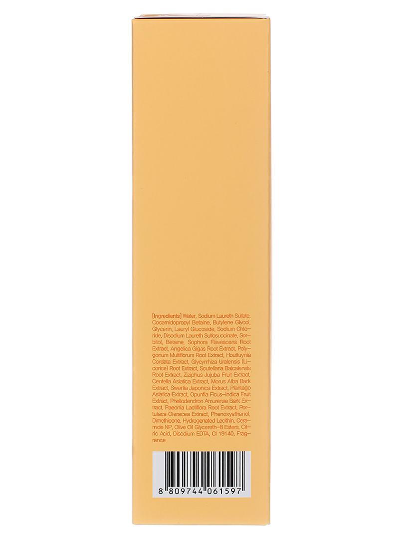 Water, Sodium Laureth Sulfate, Cocamidopropyl Betaine, Butylene Glycol, Glycerin, Lauryl Glucoside, Sodium Chloride, Disodium Laureth Sulfosuccinate, Sorbitol, Betaine, Sophora Flavescens Root Extract, Scutellaria Baicalensis Root Extract, Polygonum Multiflorum Root Extract, Houttuynia Cordata Extract, Glycyrrhiza Uralensis (Licorice) Root Extract, Centella Asiatica Extract, Angelica Gigas Root Extract, Swertia Japonica Extract, Portulaca Oleracea Extract, Plantago Asiatica Extract, Phellodendron Amurense Bark Extract, Paeonia Lactiflora Root Extract, Opuntia Ficus-Indica Fruit Extract, Morus Alba Bark Extract, Phenoxyethanol, Dimethicone, Hydrogenated Lecithin, Ceramide NP, Olive Oil Glycereth-8 Esters, Citric Acid, Disodium EDTA, CI 19140, Fragrance