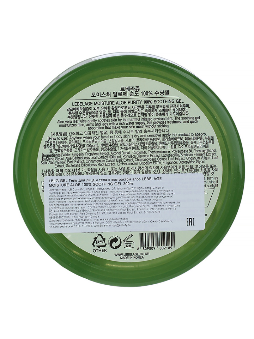 LBLG GEL Гель для лица и тела с экстрактом алоэ LEBELAGE MOISTURE ALOE 100% SOOTHING GEL 300ml