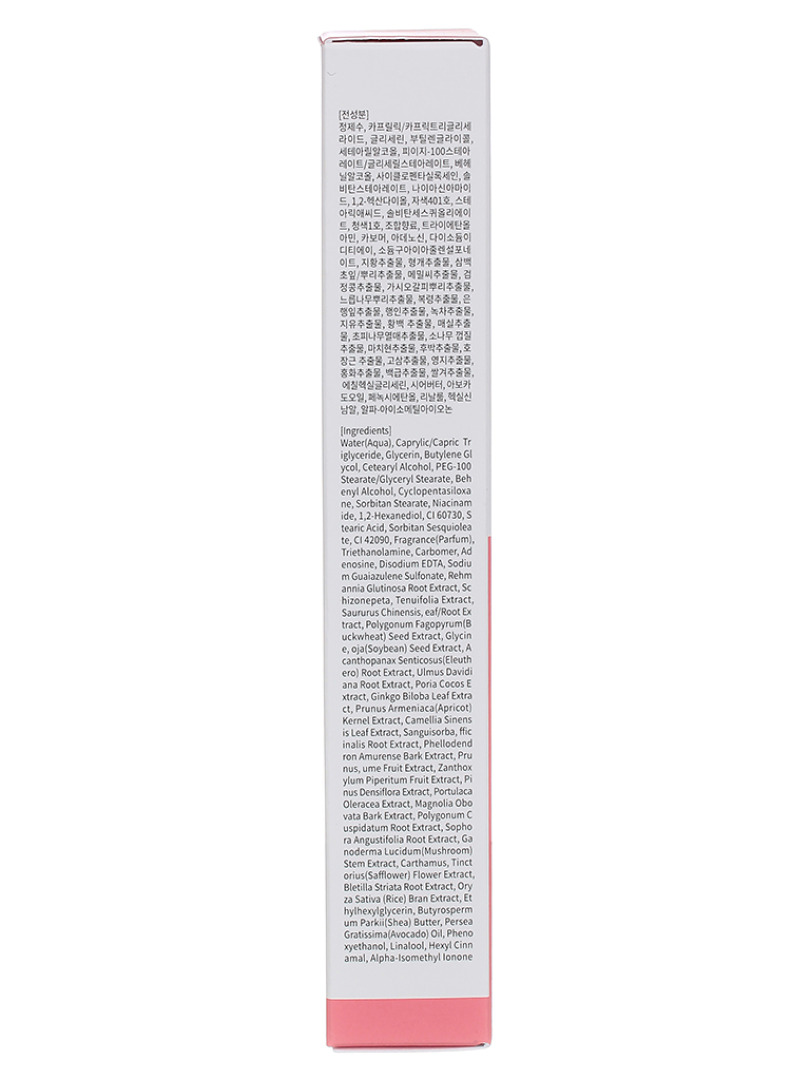Di Water, Caprylic/Capric Triglyceride, Glycerin, Butylene Glycol, Cetearyl Alcohol, PEG-100 Stearate/Glyceryl Stearate, Behenyl Alcohol, Cyclopentasiloxane, Sorbitan Stearate, Niacinamide, 1,2-Hexanediol, CI 60730, Stearic Acid, Sorbitan Sesquioleate, CI 42090, Fragrance, Triethanolamine, Carbomer, Adenosine, Disodium EDTA, Sodium Guaiazulene Sulfonate, Rehmannia Chinensis Root Extract, Schizonepeta Tenuifolia Extract, Saururus Chinensis Leaf/Root Extract, Polygonum Fagopyrum (Buckwheat) Seed Extract, Glycine Max (Soybean) Seed Extract, Acanthopanax Senticosus (Eleuthero)Root Extract, Ulmus Davidiana Root Extract, Smilax Glabra Root Extract, Ginkgo Biloba Leaf Extract, Prunus Armeniaca (Apricot) Kernel Extract, Camellia Sinensis Leaf Extract, Sanguisorba Officinalis Root Extract, Phellodendron Amurense Bark Extract, Prunus Mume Fruit Extract, Zanthoxylum Piperitum Fruit Extract, Portulaca Oleracea Extract, Magnolia Obovata Bark Extract, Polygonum Cuspidatum Root Extract, Sophora Angustifolia Root Extract, Ganoderma Lucidum (Mushroom) Stem Extract, Carthamus Tinctorius (Safflower) Flower Extract, Oryza Sativa (Rice) Bran Extract, Ethylhexylglycerin, Butyrospermum Parkii (Shea) Butter, Persea Gratissima (Avocado) Oil, Phenoxyethanol