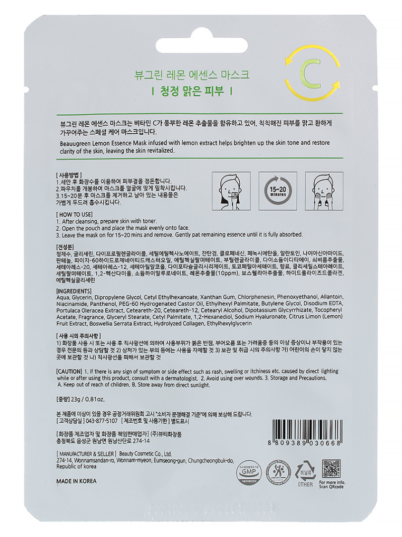 БГР Маска на тканевой основе BeauuGreen Premium Lemon Essence mask 23g