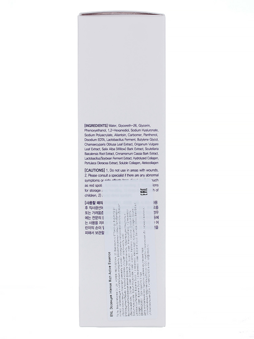 Water, Glycereth-26, Glycerin, Water, Phenoxyethanol, 1,2-Hexanediol, Sodium Hyaluronate, Sodium Polyacrylate, Water, Allantoin, Panthenol, Carbomer, Disodium EDTA, Lactobacillus Ferment, Butylene Glycol, 1,2 Hexanediol, Atelocollagen, Hydrolyzed Collagen, Soluble Collagen, Water, Butylene Glycol, 1,2-Hexanediol, Water, Butylene Glycol, Salix Alba (Willow) Bark Extract, Origanum Vulgare Leaf Extract, Chamaecyparis Obtusa Leaf Extract, Lactobacillus/Soybean Ferment Extract, Cinnamomum Cassia Bark Extract, Scutellaria Baicalensis Root Extract, Portulaca Oleracea Extract