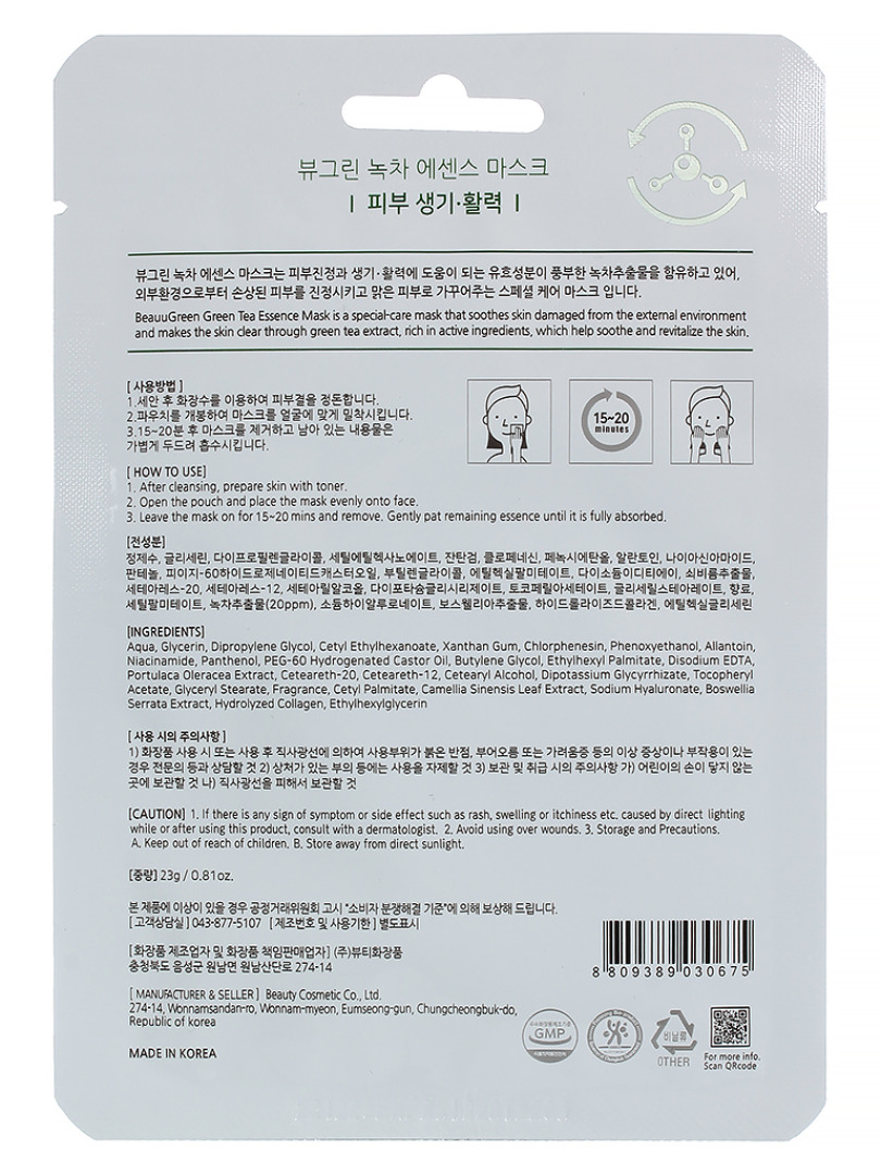 БГР Маска на тканевой основе BeauuGreen Premium Green tea Essence mask 23g