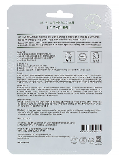 Пр-ль: Beauty Cosmetic Co.,Ltd., КОРЕЯ, РЕСПУБЛИКА, 274-14, Wonnamsandan-ro,Wonnam-myeon, Eumseong-gun, Chungcheongbuk-do. Антиоксидантная тканевая маска для лица с экстрактом зелёного чая оказывает омолаживающее действие, улучшает обмен веществ в клетках кожи, разглаживает морщины, увлажняет и питает. Экстракт зеленого чая наполняет влагой кожу, питает витамином Е, который является одним из мощных естественных антиоксидантов. Способ применения: нанесите маску на очищенную и тонизированную кожу лица, оставьте на 20-30 минут. Остатки эссенции распредеите по коже лица.
