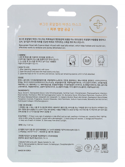 Пр-ль: Beauty Cosmetic Co.,Ltd., КОРЕЯ, РЕСПУБЛИКА, 274-14, Wonnamsandan-ro,Wonnam-myeon, Eumseong-gun, Chungcheongbuk-do. Питательная тканевая маска для лица с маточным молочком придаст тусклому кожному покрову здоровое сияние и наполнит жизненной силой. Активные компоненты, питают, насыщают полезными веществами, увлажняют и заживляют кожу, разглаживают мелкие мимические морщинки, нейтрализуют пигментацию и выравнивают тон лица. Способ применения: нанесите маску на очищенную и тонизированную кожу лица, оставьте на 20-30 минут. Остатки эссенции распредеите по коже лица.