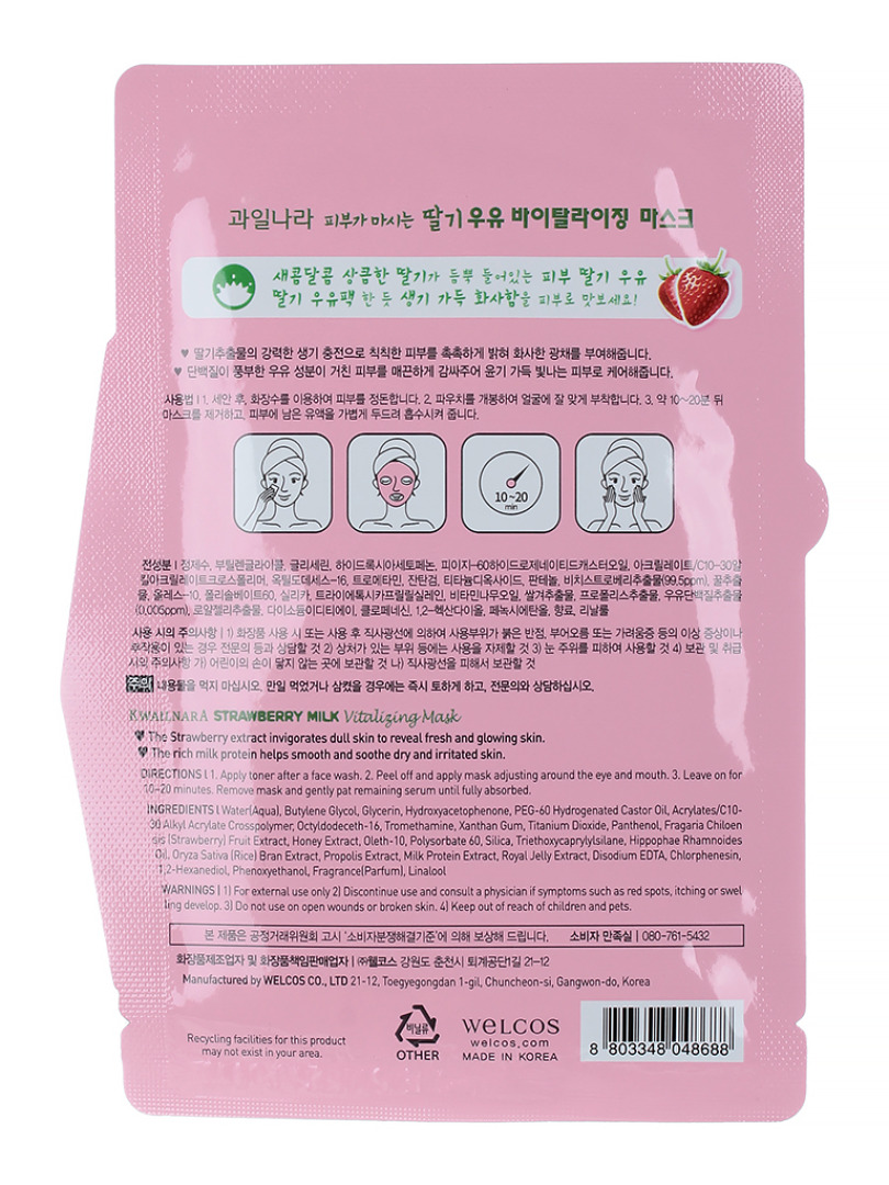Изг-ль: Welcos Co., LTD., 21-12, Toegyegongdan 1-gil, Chuncheon-si, Gangwon-do, Корея, Республика. Тканевая маска с экстрактом клубники освежает кожу, питает и придает сияние. Молочные протеины увлажняют, осветляют, насыщают кожу кальцием и витаминами. Способ применения: на очищенную и тонизированную кожу нанести маску на 10-20 минут, остатки эссенции распределите по коже лица.
