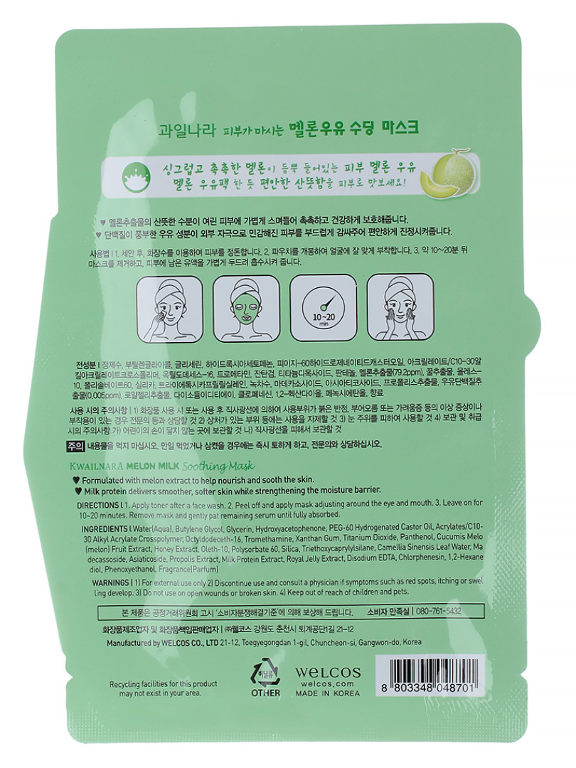 Изг-ль: Welcos Co., LTD., 21-12, Toegyegongdan 1-gil, Chuncheon-si, Gangwon-do, Корея, Республика. Тканевая маска с экстрактом дыни глубоко увлажняет и придает сияние. Экстракт мадекассосида успокаивает и заживляет различные воспаления. Молочные протеины увлажняют, осветляют, насыщают кожу кальцием и витаминами. Способ применения: на очищенную и тонизированную кожу нанести маску на 10-20 минут, остатки эссенции распределите по коже лица.