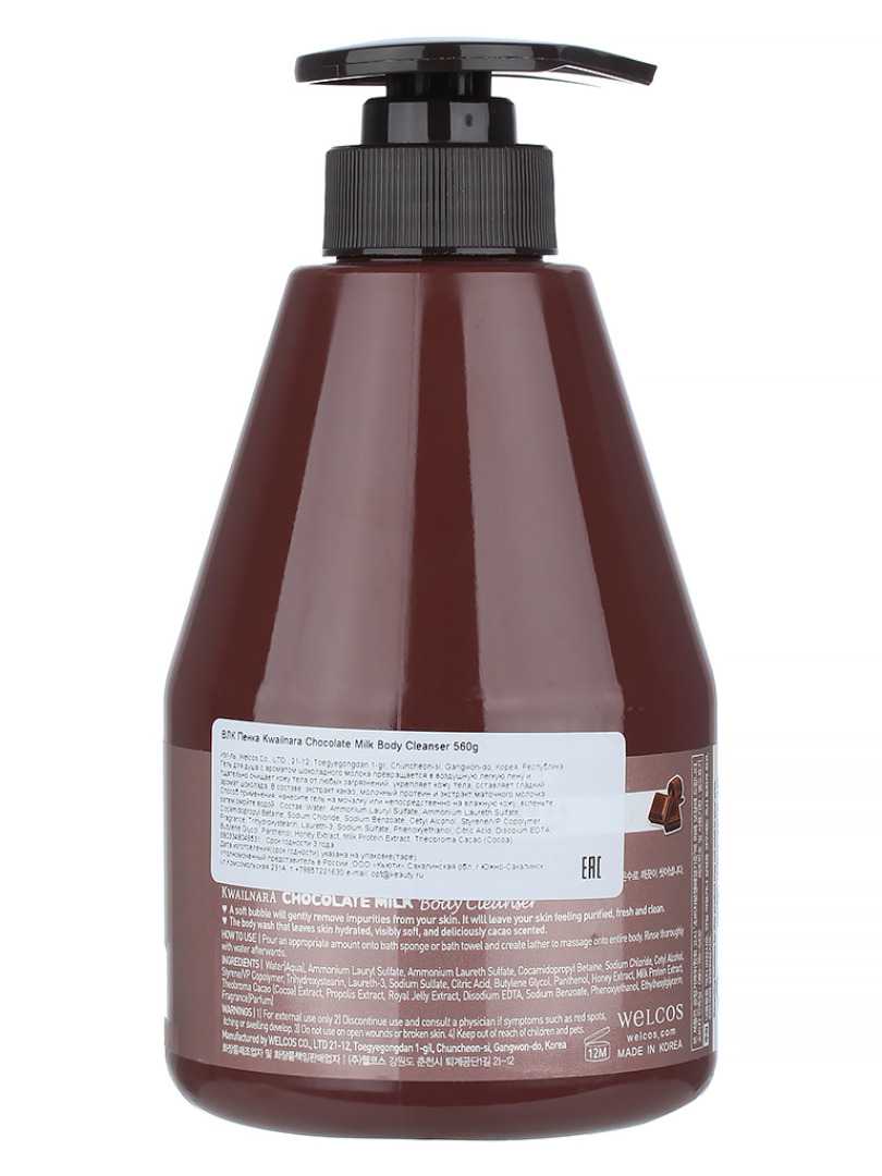 Изг-ль: Welcos Co., LTD., 21-12, Toegyegongdan 1-gil, Chuncheon-si, Gangwon-do, Корея, Республика. Гель для душа с ароматом шоколадного молока превращается в воздушную легкую пену и тщательно очищает кожу тела от любых загрязнений, укрепляет кожу тела, оставляет сладкий аромат шоколада. В составе: экстракт какао, молочный протеин и экстракт маточного молочка. Способ применения: нанесите гель на мочалку или непосредственно на влажную кожу, вспеньте, затем смойте водой.