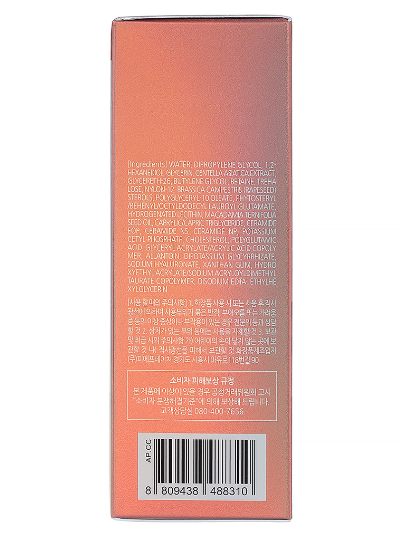 Water, Dipropylene Glycol, 1,2-Hexanediol, Glycerin, Centella Asiatica Extract, Glycereth-26, Butylene Glycol, Betaine, Trehalose, Nylon-12, Brassica Campestris (Rapeseed) Sterols, Polyglyceryl-10 Oleate, Phytosteryl/Behenyl/Octyldodecyl Lauroyl Glutamate, Hydrogenated lecithin, Macadamia Ternifolia Seed Oil, Caprylic/Capric Triglyceride, Ceramide EOP, Ceramide NS, Ceramide NP, Potassium Cetyl Phosphate, Cholesterol, Polyglutamic Acid, Glyceryl Acrylate/Acrylic Acid Copolymer, Allantoin, Dipotassium Glycyrrhizate, Sodium Hyaluronate, Xanthan Gum, Hydroxyethyl Acrylate/Sodium Acryloyldimethyl Taurate Copolymer, Disodium EDTA, Ethylhexylglycerin