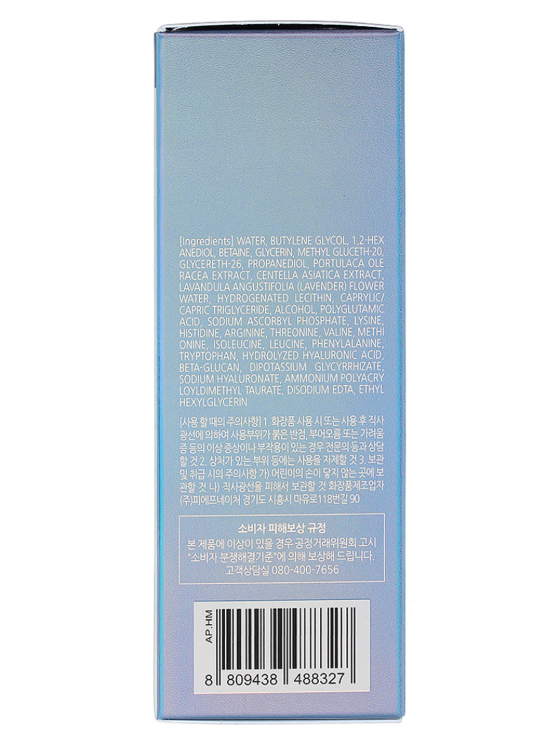 Water, Butylene Glycol, 1,2-Hexanediol, Betaine, Glycerin, Methyl Gluceth-20, Glycereth-26, Propanediol, Portulaca Oleracea Extract, Centella Asiatica Extract, Lavandula Angustifolia (Lavender) Flower Water, Hydrogenated Lecithin, Caprylic/Capric Triglyceride, Alcohol, Polyglutamic Acid, Sodium Ascorbyl Phosphate, Glycine, Serine, Glutamic Acid, Aspartic Acid, Leucine, Alanine, Lysine, Arginine, Tyrosine, Phenylalanine, Threonine, Proline, Valine, Isoleucine, Histidine, Methionine, Cysteine, Hydrolyzed Hyaluronic Acid, Beta-Glucan, Dipotassium Glycyrrhizate, Sodium Hyaluronate, Ammonium Polyacryloyldimethyl Taurate, Disodium EDTA, Ethylhexylglycerin