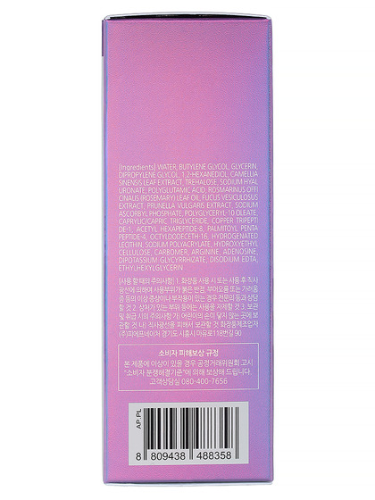 Water, Butylene Glycol, Glycerin, Dipropylene Glycol, 1,2-Hexanediol, Camellia Sinensis Leaf Extract, Trehalose, Sodium Hyaluronate, Polyglutamic Acid, Rosmarinus Officinalis (Rosemary) Leaf Oil, Fucus Vesiculosus Extract, Prunella Vulgaris Extract, Sodium Ascorbyl Phosphate, Polyglyceryl-10 Oleate, Caprylic/Capric Triglyceride, Copper Tripeptide-1, Acetyl Hexapeptide-8, Palmitoyl Pentapeptide-4, Octyldodeceth-16, Hydrogenated Lecithin, Sodium Polyacrylate, Hydroxyethylcellulose, Carbomer, Arginine, Adenosine, Dipotassium Glycyrrhizate, Disodium EDTA, Ethylhexylglycerin