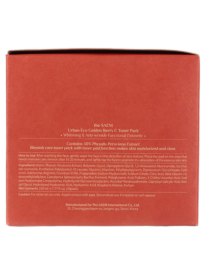 Пр-ль: THE SAEM INTERNATIONAL CO.LTD., КОРЕЯ, РЕСПУБЛИКА, 10F, 35, Cheonggyecheon-ro, Jongno-gu, Seoul. Тонкие пады, пропитанные тонером из осветляющей серии против морщин и пигментации - содержат 80% экстракта золотой перуанской ягоды (физалиса). Ткань из целлюлозы, средний слой тройной структуры, содержит большое количество эссенции для эффективной доставки активного ингредиента, а на внешней поверхности используется вискозная ткань для уменьшения раздражения. Способ применения: первый способ использования: очищенную кожу лица аккуратно протереть падом. Второй способ использования: для интенсивного ухода наложить пады как маску на участки кожи, которые нуждаются в увлажнении и осветлении. Оставить на коже на 15-20 минут
