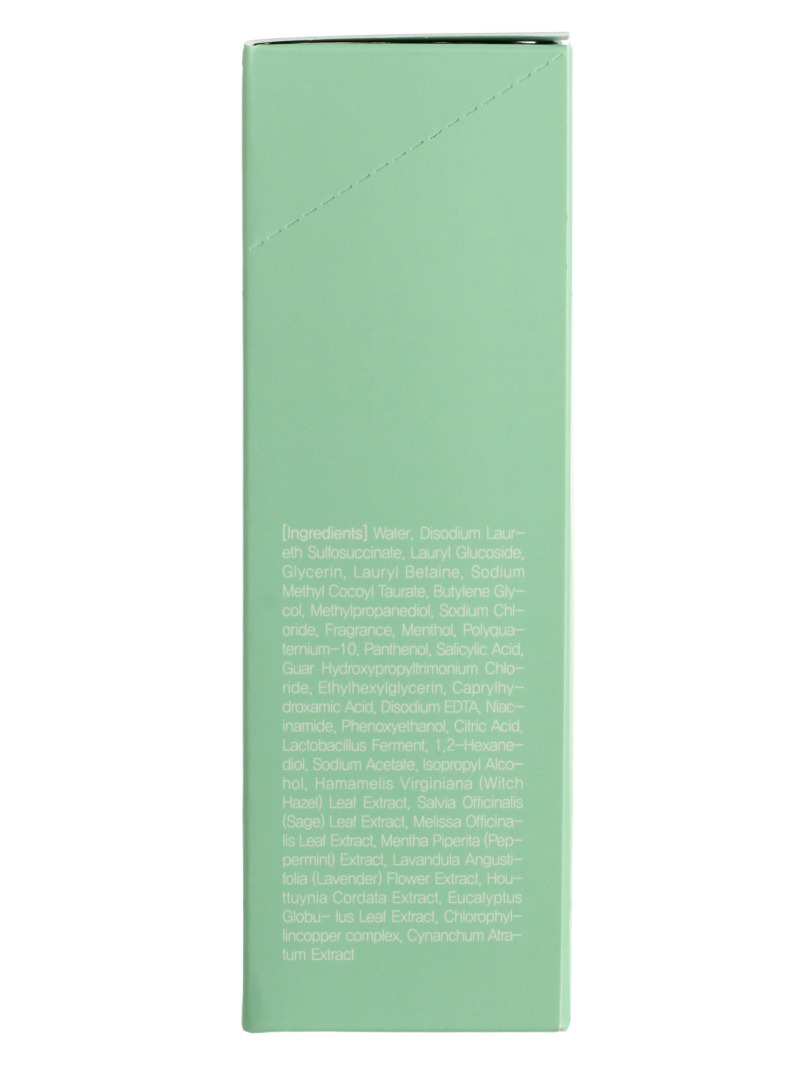 Water, Disodium Laureth Sulfosuccinate, Lauryl Betaine, Sodium Chloride, Lauryl Glucoside, Glycerin, Sodium Methyl Cocoyl Taurate, Methylpropanediol, Ethylhexylglycerin, Caprylhydroxamic Acid, Fragrance, Menthol, 1,2-Hexanediol, Hamamelis Virginiana (Witch Hazel), Leaf Extract", Salvia Officinalis (Sage) Leaf Extract, Melissa Officinalis Leaf Extract, Mentha Piperita (Peppermint) Extract, "Lavandula Angustifolia (Lavender), Flower Extract", Houttuynia Cordata Extract, Eucalyptus Globulus Leaf Extract, Polyquaternium-10, Sodium Acetate, Isopropyl Alcohol, Panthenol, Salicylic Acid, "Guar Hydroxypropyltrimonium, Chloride", Disodium EDTA, Niacinamide, Lactobacillus Ferment, Butylene Glycol, Cynanchum Atratum Extract, Phenoxyethanol, Citric Acid, Sclerocarya Birrea Seed Oil, Chlorophyllin-Copper Complex