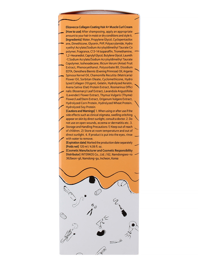 Изготовитель: INTERKOS Co.,Ltd., 62, Namdongseo-ro 362beon-gil, Namdong-gu, Incheon, Республика Корея. Крем-маска для укладки и завивки кудрявых волос с коллагеном. Нежная и легкая формула помогает завершить желаемую прическу/завивку. Помогает распутать кудрявые волосы и придает естественный вид. Содержит коллаген, растительные масла и экстракты (розмарин, вечерняя примула, ромашка, лаванда, аргана и т.д.) для увлажнения и питания волос. Способ применения: нанесите умеренное количество средства и зафиксируете желаемую укладку. После высушите феном.