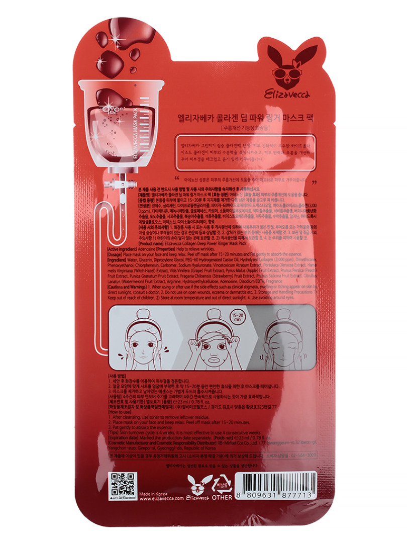 Изготовитель: RB Group Co., Ltd., Республика Корея, 67, Hwanggeum 3-ro 7beon-gil, Yangchon-eup, Gimpo-si, Gyeonggi-do. Маска на тканевой основе (для лица и тела) от бренда ELIZAVECCA COLLAGEN DEEP POWER MASK PACK. Высокоэффективная формула продукта, обогащенная гиалуроновой кислотой, коллагеном, натуральными экстрактами гамамелиса, портулака, винограда, яблока, персика граната, сливы, арбуза. Способ применения: распределить маску на кожу, разгладить и оставить на 15-20 минут.