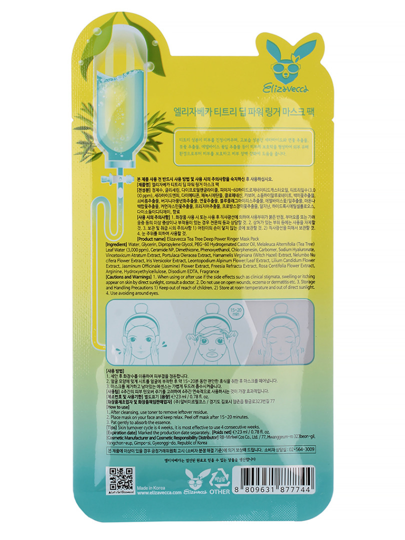 Изготовитель: RB Group Co., Ltd., Республика Корея, 67, Hwanggeum 3-ro 7beon-gil, Yangchon-eup, Gimpo-si, Gyeonggi-do. ELIZAVECCA TEA TREE DEEP POWER RINGER MASK PACK чудесная тканевая маска станет настоящим открытием для обладательниц жирной проблемной кожи, склонной к угревой сыпи, раздражениям и воспалениям. Способ применения: распределить маску на кожу, разгладить и оставить на 15-20 минут.