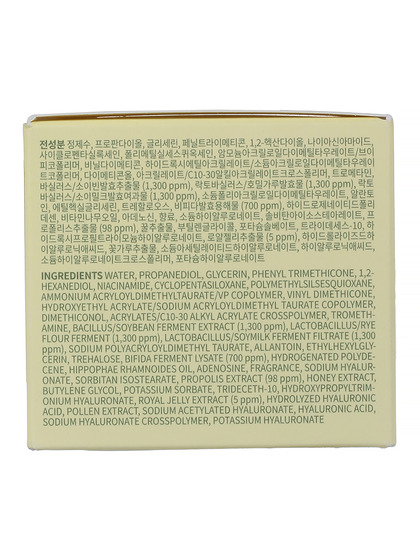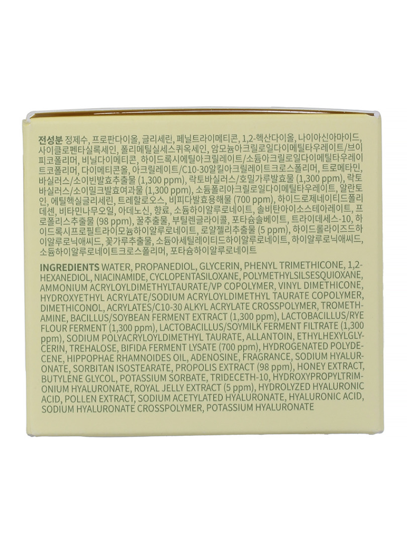 Water, Propanediol, Glycerin, Phenyl Trimethicone, 1,2-Hexanediol, Niacinamide, Cyclopentasiloxane, Polymethylsilsesquioxane, Ammonium Acryloyldimethyltaurate/Vp Copolymer, Vinyl Dimethicone, Hydroxyethyl Acrylate/Sodium Acryloyldimethyl Taurate Copolymer, Dimethiconol, Acrylates/C10-30 Alkyl Acrylate Crosspolymer, Tromethamine, Bacillus/Soybean Ferment Extract, Lactobacillus/Rye Flour Ferment, Lactobacillus/Soymilk Ferment Filtrate, Sodium Polyacryloyldimethyl Taurate, Allantoin, Ethylhexylglycerin, Trehalose, Bifida Ferment Lysate, Hydrogenated Polydecene, Adenosine, Hippophae Rhamnoides Oil, Sodium Hyaluronate, Sorbitan Isostearate, Propolis Extract, Honey Extract, Butylene Glycol, Potassium Sorbate, Trideceth-10, Hydroxypropyltrimonium Hyaluronate, Royal Jelly Extract, Hydrolyzed Hyaluronic Acid, Pollen Extract, Sodium Acetylated Hyaluronate, Hyaluronic Acid, Sodium Hyaluronate Crosspolymer, Potassium Hyaluronate, Fragrance
