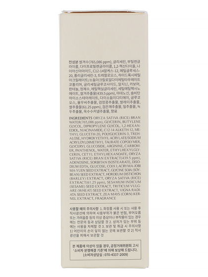 Oryza Sativa (Rice) Bran Water, Glycerin, Butylene Glycol, Dipropylene Glycol, 1,2-Hexanediol, Niacinamide, C12-14 Alketh-12, Methyl Gluceth-20, Polyglycerin-3, Trehalose, Hydroxyethyl Acrylate/Sodium Acryloyldimethyl Taurate Copolymer, Glyceryl Glucoside, Arginine, Carbomer, Panthenol, Water, Fragrance, Ethylhexylglycerin, Cetyl Ethylhexanoate, Oryza Sativa (Rice) Bran Extract, Adenosine, Sorbitan Isostearate, Disodium Edta, Glucose, Coix Lacryma-Jobi Ma-Yuen Seed Extract, Glycine Soja (Soybean) Seed Extract, Hordeum Distichon (Barley) Extract, Oryza Sativa (Rice) Extract, Sesamum Indicum (Sesame) Seed Extract, Triticum Vulgare (Wheat) Seed Extract, Vigna Radiata Seed Extract, Zea Mays (Corn) Kernel Extract