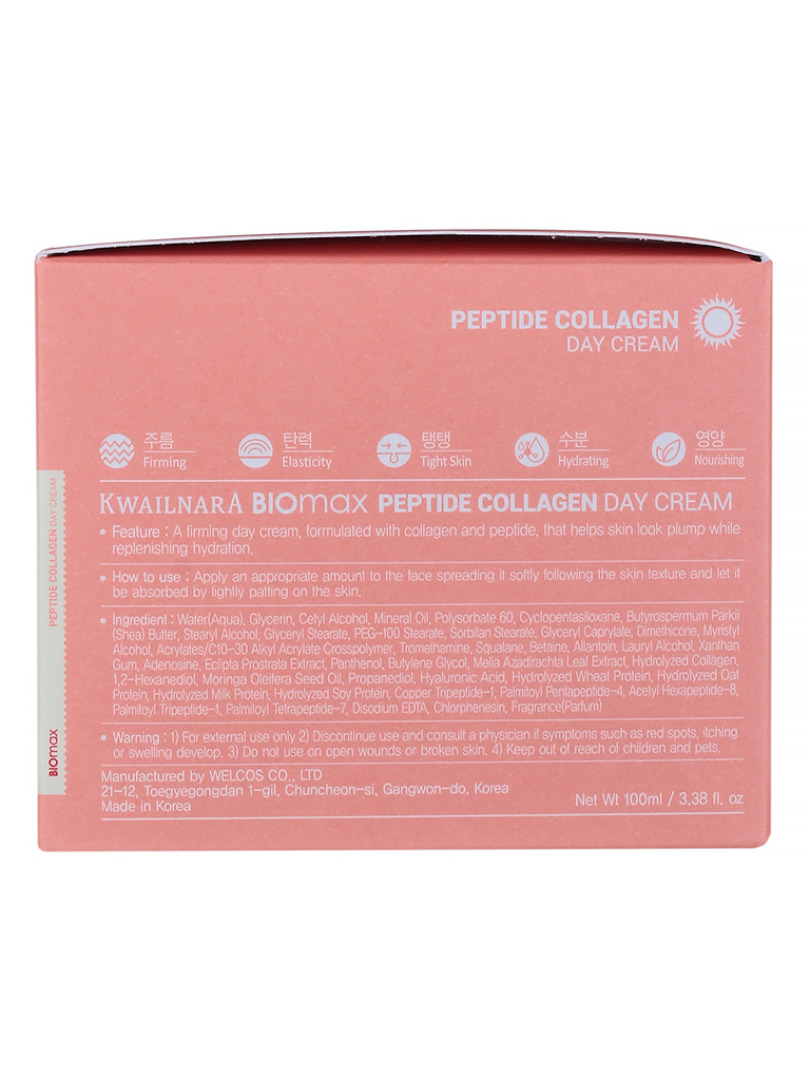 Изг-ль: Welcos Co., LTD., КОРЕЯ, РЕСПУБЛИКА, 21-12, Toegyegongdan 1-gil, Chuncheon-si, Gangwon-do. Kwailnara Biomax Peptide Collagen Day Cream. Дневной крем восстанавливает жизненные силы и молодость кожи, делая ее более здоровой и молодой. Комплекс пептидов уменьшают появление морщин, делая кожу более гладкой, а коллаген (двойной коллаген низкой молекулярной массы и высокой) повышает упругость и эластичность кожи, делая ее более молодой и упругой.