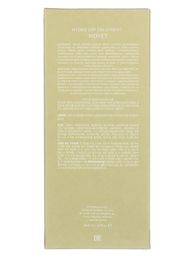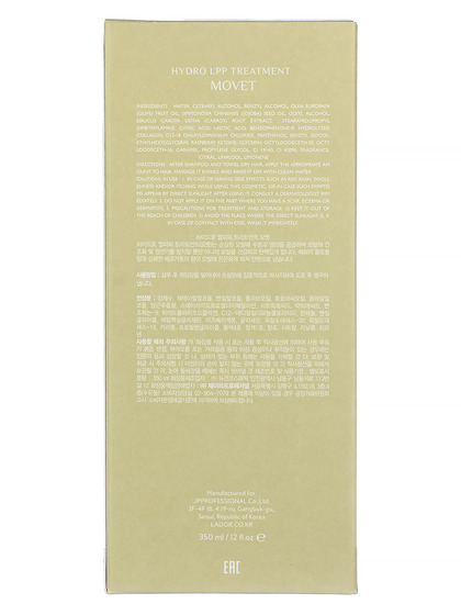 Изг-ль: NEWGENCOSMETICS CO., LTD., Республика Корея, 12, Namdongseo-ro 113beon-gil, Namdong-gu, Incheon. Маска для поврежденных волос парфюмированная с ароматом бергамота. HYDRO LPP TREATMENT (MOVET) 350ML. Средство, созданное на основе растительных масел, полученных из семян жожоба и оливы, проверенных EWG, помогает поддерживать водно-масляный баланс волос и возвращает им естественный блеск. Натуральный аминокислотный комплекс LPP оказывает мощное регенерирующее и укрепляющее действие. Коллаген в составе средства является источником силы, здоровья и блеска волос. Способ применения: на очищенные шампунем волосы нанесите маску массажными движениями, смойте теплой водой.