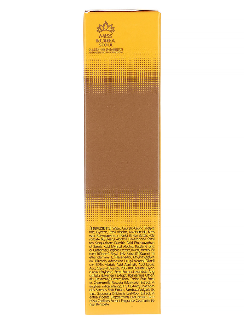 Water, Caprylic/Capric Triglyceride, Glycerin, Cetyl Alcohol, Niacinamide, Beeswax, Butyrospermum Parkii (Shea) Butter, Polysorbate 60, Stearyl Alcohol, Dimethicone, Sorbitan Sesquioleate, Palmitic Acid, Phenoxyethanol, Stearic Acid, Myristyl Alcohol, Butylene Glycol, Carbomer, Propolis Extract(100m), Honey Extract(100ppm), Royal Jelly Extract (100ppm), Triethanolamine, 1,2-Hexanediol, Ethylhexylglycerin, Allantoin, Adenosine, Lauryl Alcohol, Disodium EDTA, Myristic Acid, Arachidic Acid, Lauric Acid, Glyceryl Stearate, PEG-100 Stearate, Glycine Max (Soybean) Seed Extract, Lavandula Angustifolia (Lavender) Extract, Rosmarinus Officinalis (Rosemary) Extract, Rosa Canina Fruit Extract, Chamomilla Recutita (Matricaria) Extract, Mangifera Indica (Mango) Fruit Extract, Chaenomeles Sinensis Fruit Extract, Bambusa Vulgaris Extract, Saponaria Officinalis Leaf/Root Extract, Mentha Piperita (Peppermint) Leaf Extract, Artemisia Capillaris Extract, Fragrance, Coumarin, Benzyl Benzoate.