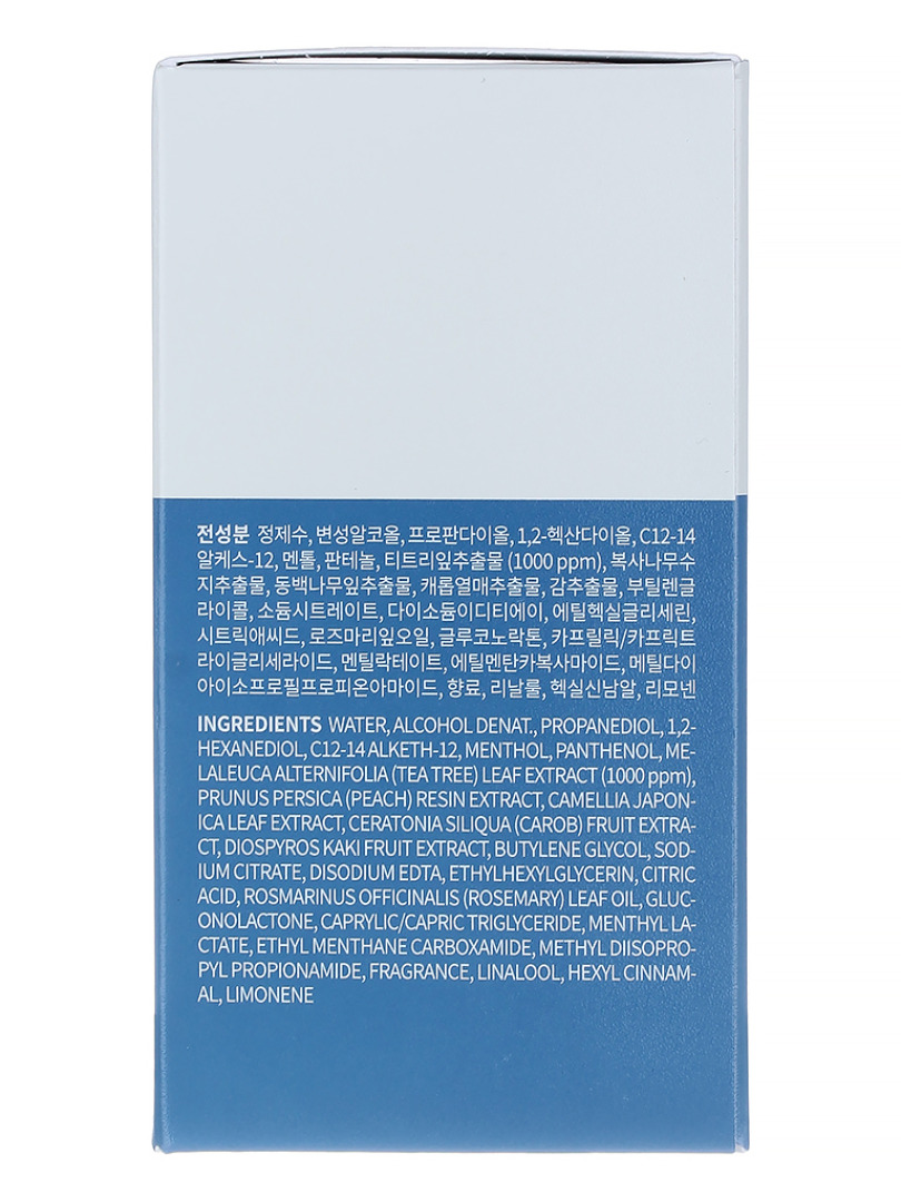 Water, Alcohol Denat., Propanediol, 1,2-Hexanediol, C12-14 Alketh-12, Menthol, Panthenol, Fragrance, Butylene Glycol, Sodium Citrate, Disodium Edta, Ethylhexylglycerin, Citric Acid, Rosmarinus Officinalis (Rosemary) Leaf Oil, Linalool, Hexyl Cinnamal, Prunus Persica (Peach) Resin Extract, Camellia Japonica Leaf Extract, Ceratonia Siliqua (Carob) Fruit Extract, Diospyros Kaki Fruit Extract, Limonene, Gluconolactone, Caprylic/Capric Triglyceride, Menthyl Lactate, Ethyl Menthane Carboxamide, Melaleuca Alternifolia (Tea Tree) Leaf Extract, Methyl Diisopropyl Propionamide