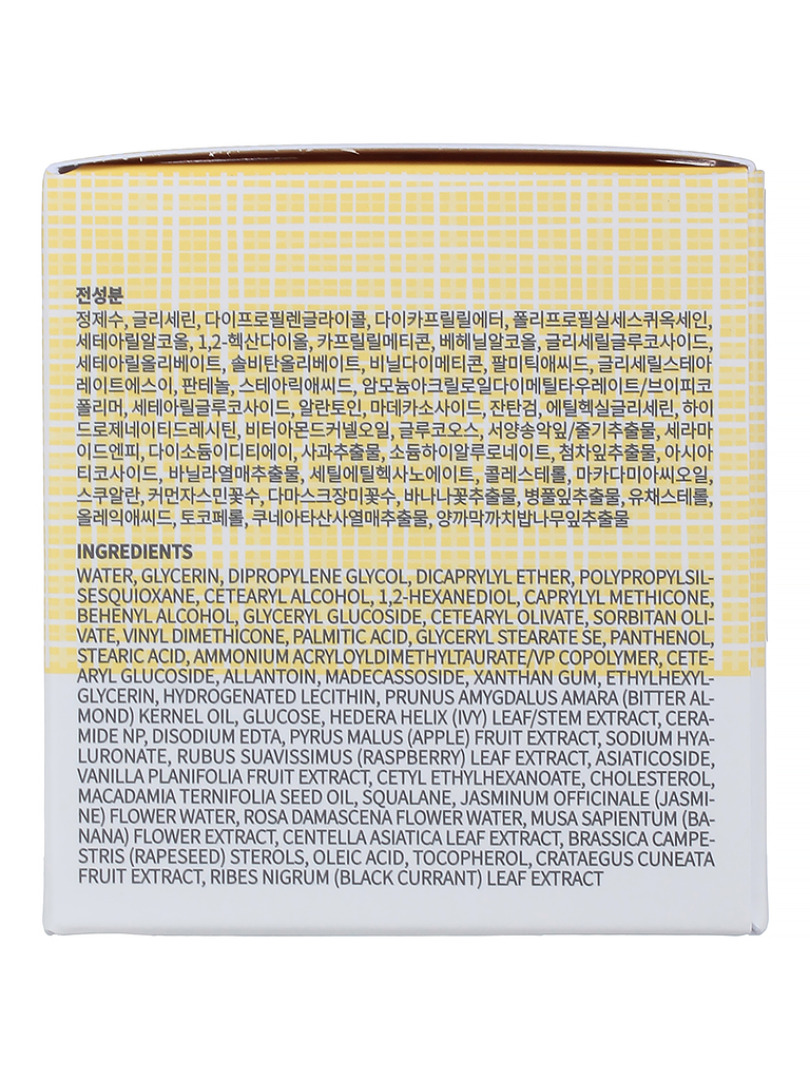 Water, Glycerin, Dipropylene Glycol, Dicaprylyl Ether, Polypropylsilsesquioxane, Cetearyl Alcohol, 1,2-Hexanediol, Caprylyl Methicone, Behenyl Alcohol, Glyceryl Glucoside, Cetearyl Olivate, Sorbitan Olivate, Vinyl Dimethicone, Palmitic Acid, Glyceryl Stearate Se, Panthenol, Stearic Acid, Ammonium Acryloyldimethyltaurate/Vp Copolymer, Cetearyl Glucoside, Allantoin, Madecassoside, Xanthan Gum, Ethylhexylglycerin, Hydrogenated Lecithin, Prunus Amygdalus Amara (Bitter Almond) Kernel Oil, Glucose, Hedera Helix (Ivy) Leaf/Stem Extract, Ceramide Np, Disodium Edta, Pyrus Malus (Apple) Fruit Extract, Sodium Hyaluronate, Rubus Suavissimus (Raspberry) Leaf Extract, Asiaticoside, Vanilla Planifolia Fruit Extract, Cetyl Ethylhexanoate, Cholesterol, Macadamia Ternifolia Seed Oil, Squalane, Jasminum Officinale (Jasmine) Flower Water, Rosa Damascena Flower Water, Musa Sapientum (Banana) Flower Extract, Centella Asiatica Leaf Extract, Brassica Campestris (Rapeseed) Sterols, Oleic Acid, Tocopherol, Crataegus Cuneata Fruit Extract, Ribes Nigrum (Black Currant) Leaf Extract