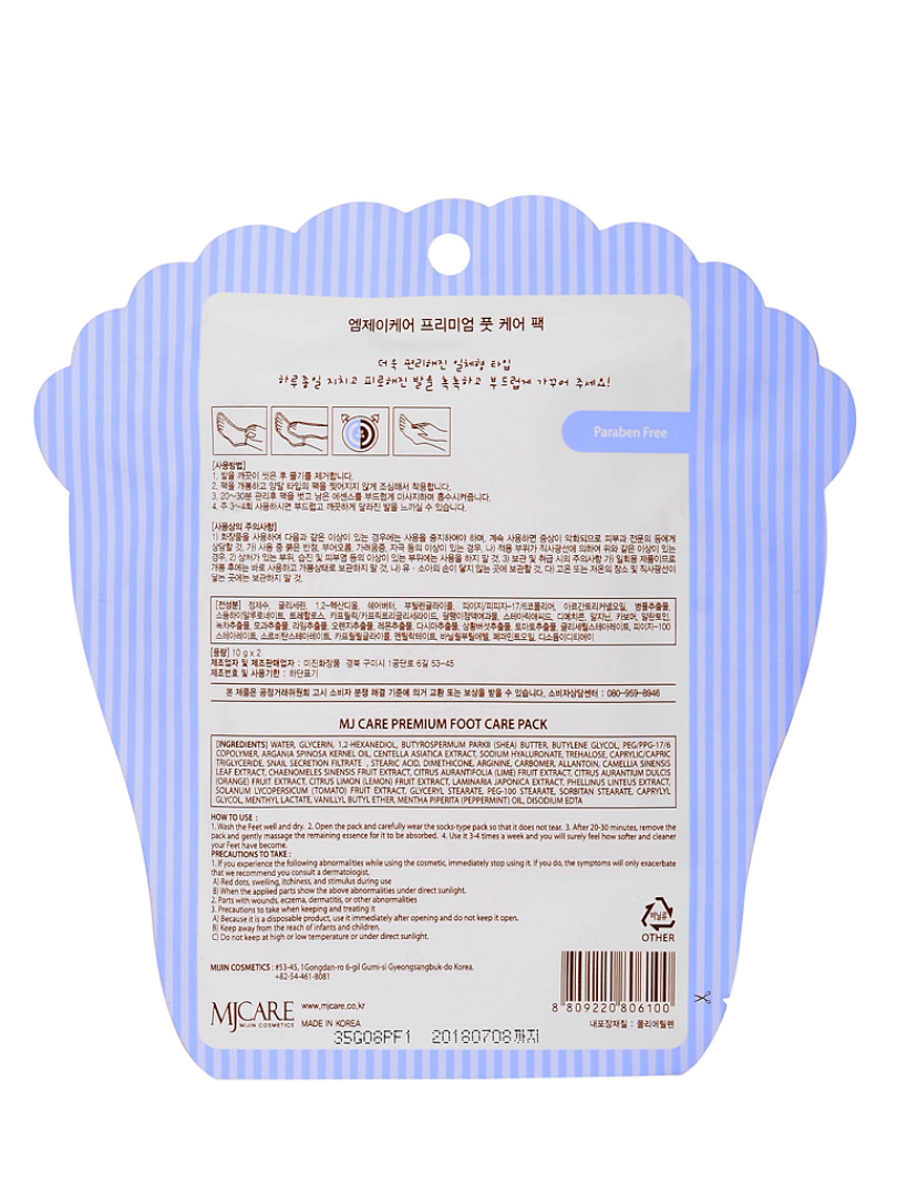 Изготовитель: MIJIN COSMETICS, Республика Корея, 53-45, 1 Gongdan-ro 6-gil, Gumi-si Gyeongsangbuk-do. Маска-комплекс предназначена для ухода за сухой и огрубевшей кожей ног в домашних условиях. Увлажняет и смягчает кожу ног, снимает усталость и обеспечивает бережный уход. Мягкая кремовая эссенция глубоко питает и освежает кожу, смягчает и заботится о каждом участке ваших ног. Способ применения: Помойте и вытрите насухо ноги перед применением маски. Достаньте носочки, пропитанные эссенцией, и наденьте их на ноги. Помассируйте ноги и равномерно распределите эссенцию внутри носочков. Через 30 минут снимите носочки, помассируйте ноги, чтобы впитались остатки эссенции. Не смывайте.Рекомендуется использовать 2-3 раза в неделю.Объем: 10гр*2