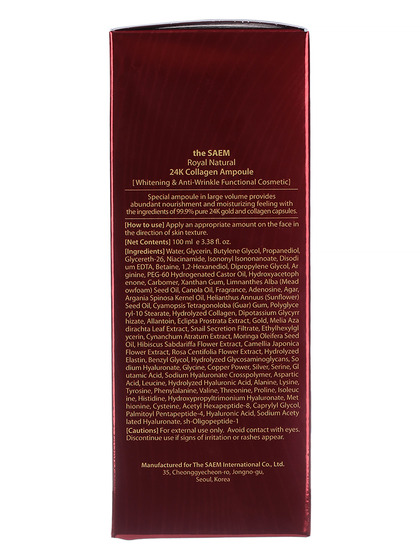 Изг-ль: THE SAEM INTERNATIONAL CO.LTD., КОРЕЯ, РЕСПУБЛИКА, 10F, 35, Cheonggyecheon-ro, Jongno-gu, Seoul. Сыворотка содержит 99,9 % 24К золота и коллагеновые капсулы, питают, придают и насыщают кожу влагой. Гидролизованная гиалуроновая кислота сохраняет кожу упругой и эластичной, наполняет жизненной силой. Также средство содержит аминокислоты, пептиды и ингредиенты красных цветов (экстракт гибискуса, экстракт цветов камелии и прованской розы), которые создают и обволакивают кожу увлажняющем слоем. Способ применения: на очищенную и тонизированную кожу нанесите средство.