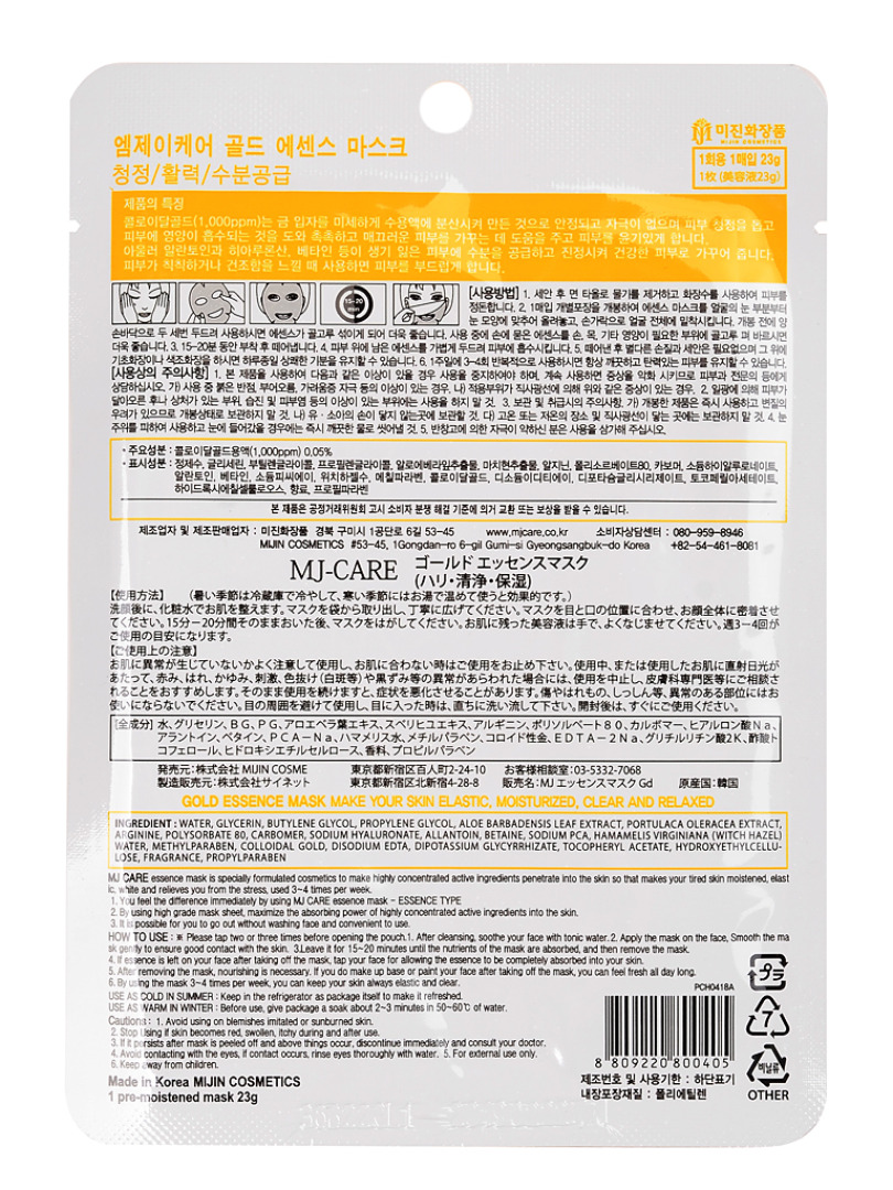 Изготовитель: «MIJIN COSMETICS », Южная Корея. 53-45, 1 Gongdan-ro 6 Gil, Gumi-si, Gyeongsangbuk-do. Маска с коллоидным золотом предназначена для борьбы с признаками старения кожи, эффективно разглаживает морщинки, придает коже упругость и эластичность, подтягивает, увлажняет и питает, улучшает цвет и придает здоровое сияние. Нежная, мягкая основа маски идеально ложится на кожу, обеспечивая быстрое и глубокое проникновение пит.веществ.В состав входят масло ши (карите), масло жожоба, гиалуроновая кислота, аллантоин, натуральные экстракты портулака огородного и гамамелиса.Способ применения: нанести маску на очищенную кожу лица. Оставить на 20-30 минут. Снять маску и распределить остатки по поверхности кожи. Не смывать.