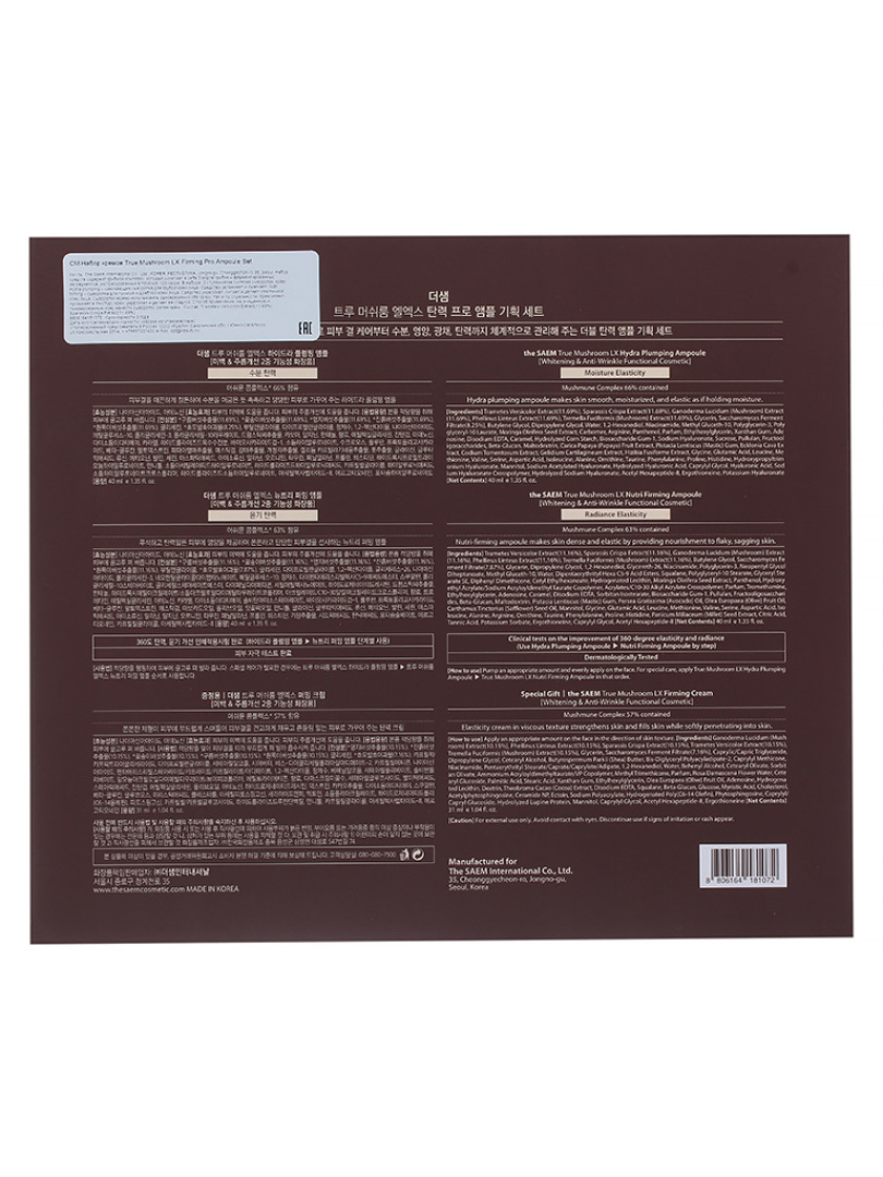 Изг-ль: The Saem International Co., Ltd., КОРЕЯ, РЕСПУБЛИКА, Jongro-gu, Chonggechon-ro 35, Seoul. Набор средств содержит грибной комплекс, который сочетает в себе 5 видов грибов и ферментированных ингредиентов, экстрагированных в течение 100 часов. В наборе: 2 ступенчатая система сывороток, крем. Hydra plumping – смягчающая сыворотка для грубой кожи лица. Средство увлажняет и смягчает. Nutri firming – сыворотка для тусклой и дряблой кожи лица. Средство укрепляет, питает и делает эластичной кожу лица. Сыворотки можно использовать одновременно обе сразу, так и по отдельности. Крем нежно проникает в текстуру кожи, укрепляет и делает ее гладкой. Способ применения: на очищенную и тонизированную кожу нанести сыворотку, затем крем.