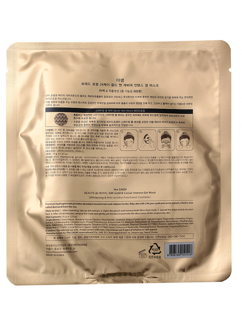 Изг-ль: THE SAEM INTERNATIONAL CO.LTD., КОРЕЯ, РЕСПУБЛИКА, 10F, 35, Cheonggyecheon-ro, Jongno-gu, Seoul. Гидрогелевая маска премиум-класса с 24 К золота и черной икры интенсивно укрепляет, питает, увлажняет сухую и грубую кожу лица. Маска выполнена из двухслойного гидрогеля, благодаря чему средство эффективно увлажняет и насыщает питательными веществами. Способ применения: на очищенную и тонизированную кожу нанесите маску и приложите к коже. Оставьте на 20-40 минут.