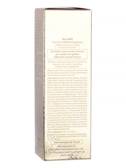 Изг-ль: The Saem International Co., Ltd., КОРЕЯ, РЕСПУБЛИКА, Jongro-gu, Chonggechon-ro 35, Seoul. Укрепляющая сыворотка с муцином улитки и 24К золота для лица, которая обеспечивает гладкую и шелковистую текстуру кожу лица с усиленным питанием, также средство укрепляет, увлажняет, разглаживает морщины и придает сияние. Способ применения: нанесите похлопывающими движениями на очищенную и тонизированную кожу лица.