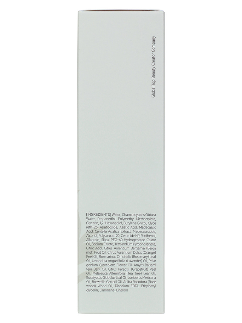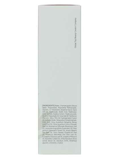 Water, Propanediol, Polymethyl Methacrylate, Glycerin, 1,2-Hexanediol, Butylene Glycol, Glycereth-26, Silica, Alcohol, PEG-60 Hydrogenated Castor Oil, Sodium Citrate, Ethylhexylglycerin, Centella Asiatica Extract, Tetrasodium Pyrophosphate, Chamaecyparis Obtusa Water, Citric Acid, Disodium EDTA, Citrus Aurantium Bergamia (Bergamot) Fruit Oil, Polysorbate 20, Panthenol, Citrus Aurantium Dulcis (Orange) Peel Oil, Rosmarinus Officinalis (Rosemary) Leaf Oil, Lavandula Angustifolia (Lavender) Oil, Allantoin, Amyris Balsamifera Bark Oil, Pelargonium Graveolens Flower Oil, Melaleuca Alternifolia (Tea Tree) Leaf Oil, Citrus Paradisi (Grapefruit) Peel Oil, Eucalyptus Globulus Leaf Oil, Madecassoside, Juniperus Mexicana Oil, Boswellia Carterii Oil, Asiatic Acid, Asiaticoside, Madecassic Acid, Aniba Rosaeodora (Rosewood) Wood Oil, Ceramide NP