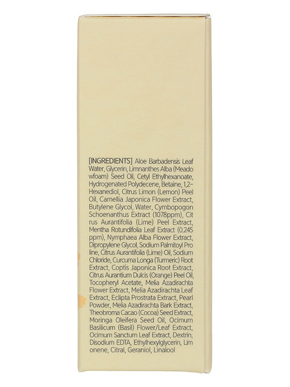 Water, Glycerin, Limnanthes Alba (Meadowfoam) Seed Oil, Cetyl Ethylhexanoate, Hydrogenated Polydecene, Betaine, Butylene Glycol, 1,2-Hexanediol, Citrus Limon (Lemon) Peel Oil, Citrus Aurantifolia (Lime) Oil, Sodium Chloride, Aloe Barbadensis Leaf Water, Curcuma Longa (Turmeric) Root Extract, Phenoxyethanol, Coptis Japonica Root Extract, Cymbopogon Schoenanthus Extract, Citrus Aurantium Dulcis (Orange) Peel Oil, Ethylhexylglycerin, Tocopheryl Acetate, Melia Azadirachta Flower Extract, Melia Azadirachta Leaf Extract, Eclipta Prostrata Extract, Melia Azadirachta Bark Extract, Pearl Powder, Disodium EDTA, Theobroma Cacao (Cocoa) Seed Extract, Moringa Oleifera Seed Oil, Ocimum Basilicum (Basil) Flower/Leaf Extract, Ocimum Sanctum Leaf Extract, Dextrin, Camellia Japonica Flower Extract, Mentha Rotundifolia Leaf Extract, Citrus Aurantifolia (Lime) Peel Extract, Dipropylene Glycol, Sodium Palmitoyl Proline, Nymphaea Alba Flower Extract