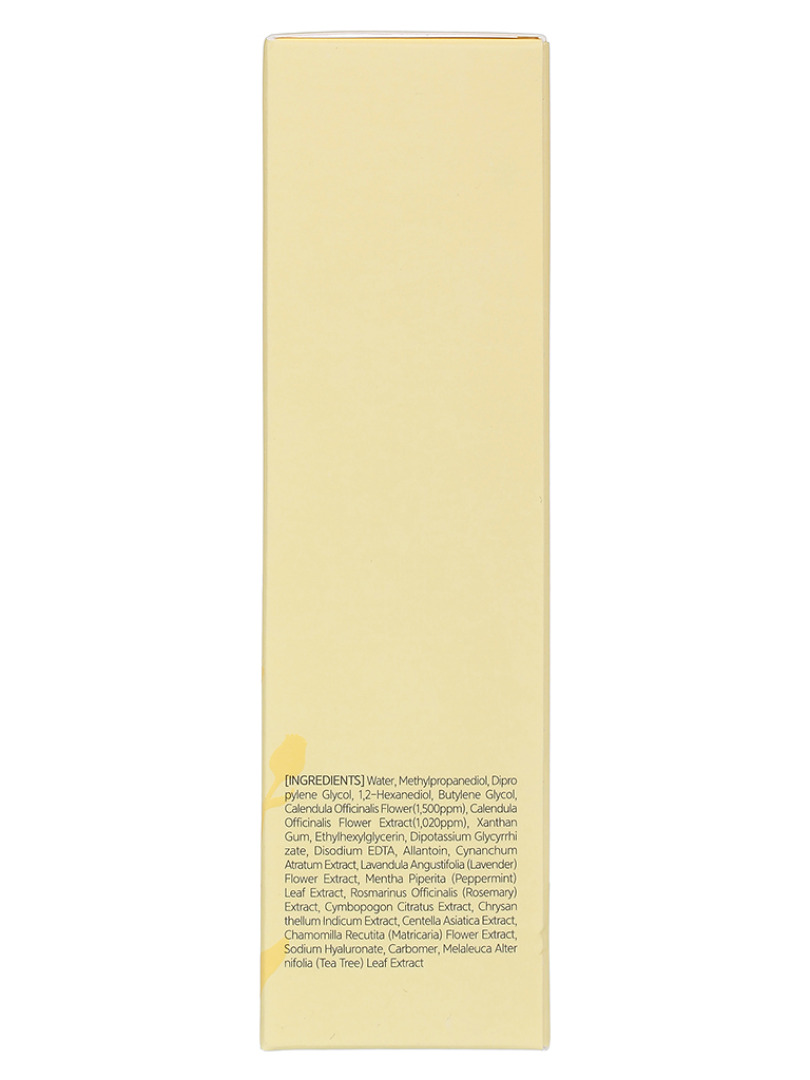 Water, Methylpropanediol, Dipropylene Glycol, 1,2-Hexanediol, Butylene Glycol, Calendula Officinalis Flower, Calendula Officinalis Flower Extract, Xanthan Gum, Ethylhexylglycerin, Dipotassium Glycyrrhizate, Disodium EDTA, Allantoin, Cynanchum Atratum Extract, Lavandula Angustifolia (Lavender) Flower Extract, Mentha Piperita (Peppermint) Leaf Extract, Rosmarinus Officinalis (Rosemary) Extract, Cymbopogon Citratus Extract, Chrysanthellum Indicum Extract, Centella Asiatica Extract, Chamomilla Recutita (Matricaria) Flower Extract, Sodium Hyaluronate, Carbomer, Melaleuca Alternifolia (Tea Tree) Leaf Extract