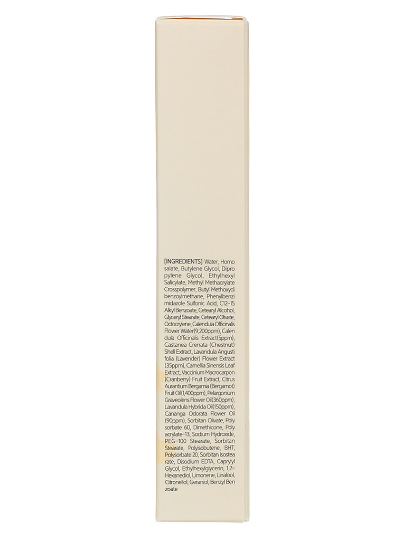Water, Homosalate, Butylene Glycol, Dipropylene Glycol, Ethylhexyl Salicylate, Methyl Methacrylate Crosspolymer, Butyl Methoxydibenzoylmethane, Phenylbenzimidazole Sulfonic Acid, C12-15 Alkyl Benzoate, Cetearyl Alcohol, Glyceryl Stearate, Cetearyl Olivate, Octocrylene, Calendula officinalis flower water, Sorbitan Olivate, Polysorbate 60, Dimethicone, Polyacrylate-13, Sodium Hydroxide, Caprylyl Glycol, PEG-100 Stearate, Sorbitan Stearate, Polyisobutene, Ethylhexylglycerin, Citrus Aurantium Bergamia (Bergamot) Fruit Oil, Disodium EDTA, 1,2-Hexanediol, BHT, Polysorbate 20, Pelargonium Graveolens Flower Oil, Sorbitan Isostearate, Lavandula Hybrida Oil, Cananga Odorata Flower Oil, Camellia Sinensis Leaf Extract, Castanea Crenata (Chestnut) Shell Extract, Lavandula Angustifolia (Lavender) Flower Extract, Vaccinium Macrocarpon (Cranberry) Fruit Extract, Calendula Officinalis Extract
