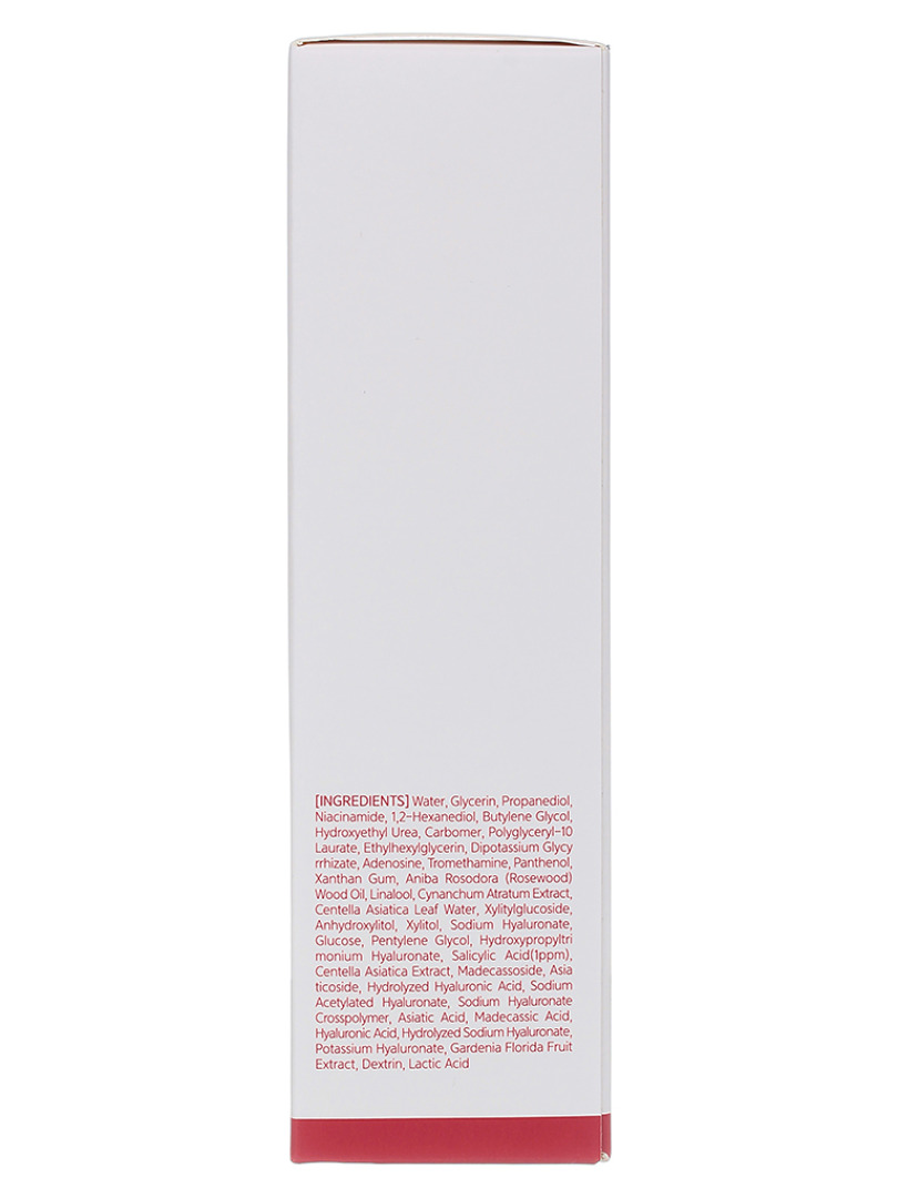 Water, Glycerin, Propanediol, Niacinamide, 1,2-Hexanediol, Butylene Glycol, Hydroxyethyl Urea, Carbomer, Polyglyceryl-10 Laurate, Ethylhexylglycerin, Dipotassium Glycyrrhizate, Adenosine, Gardenia Florida Fruit Extract, Tromethamine, Panthenol, Dextrin, Xanthan Gum, Cynanchum Atratum Extract, Centella Asiatica Leaf Water, Aniba Rosodora (Rosewood) Wood Oil, Xylitylglucoside, Anhydroxylitol, Xylitol, Sodium Hyaluronate, Glucose, Pentylene Glycol, Hydroxypropyltrimonium Hyaluronate, Salicylic Acid, Centella Asiatica Extract, Madecassoside, Asiaticoside, Hydrolyzed Hyaluronic Acid, Sodium Acetylated Hyaluronate, Lactic Acid, Sodium Hyaluronate Crosspolymer, Asiatic Acid, Madecassic Acid, Hyaluronic Acid, Hydrolyzed Sodium Hyaluronate, Potassium Hyaluronate, Linalool