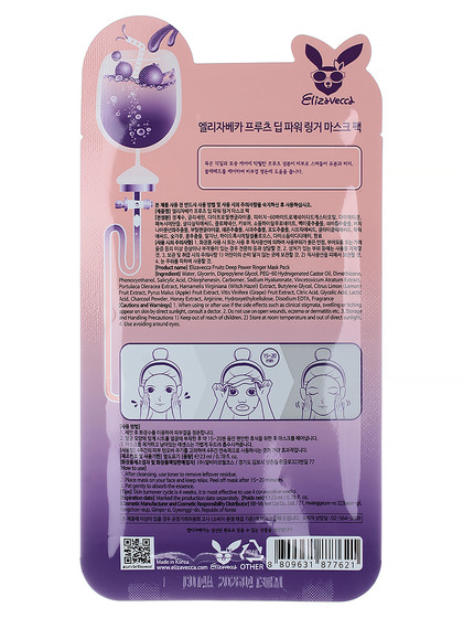 Изг-ль: RB Group Co., Ltd., 67, Hwanggeum 3-ro 7beon-gil, Yangchon-eup, Gimpo-si, Gyeonggi-do, РЕСП. КОРЕЯ. Маска на тканевой основе от бренда ELIZAVECCA FRWTS DEEP POWER RINGER MASK PACK. Маска на основе фруктовых экстрактов проникает глубоко в слои кожи, устраняет воспаления, борется с камедонами, улучшает цвет лица, помогает уменьшить морщины, делает кожу увлажненной и посвежевшей. Способ применения: распределить маску на кожу, разгладить и оставить на 15-20 минут. Затем снять.