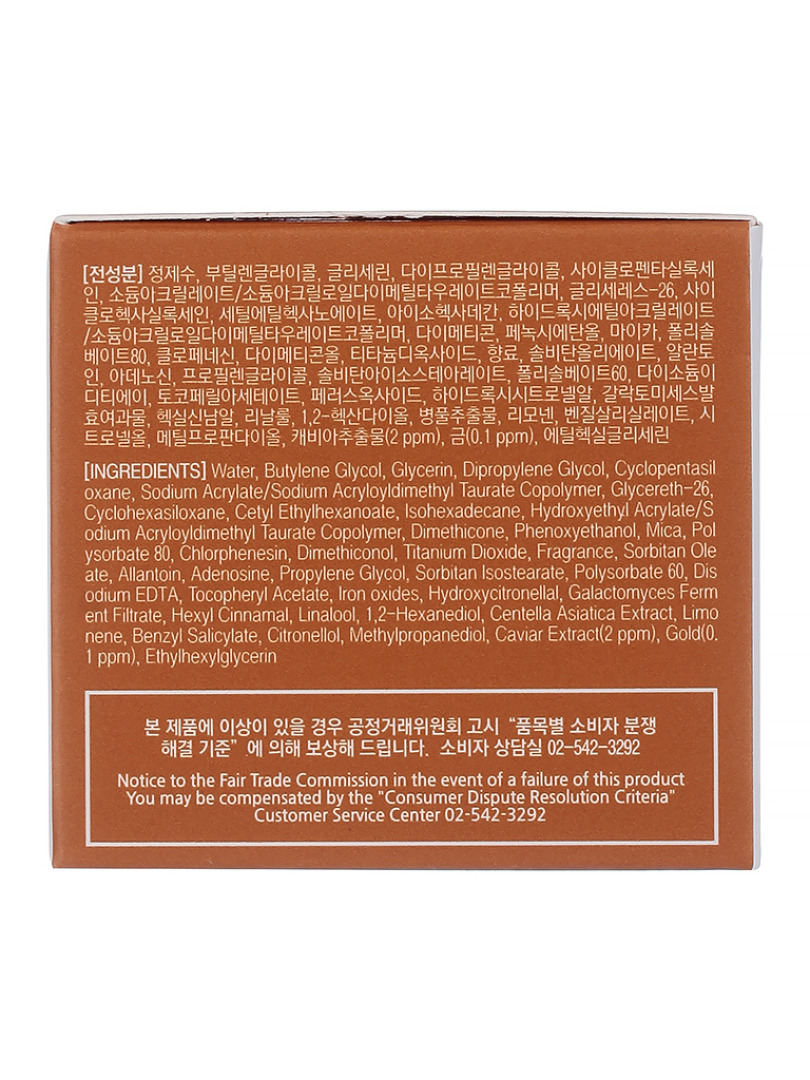 Water, Butylene Glycol, Glycerin, Dipropylene Glycol, Cyclopentasiloxane, "Sodium Acrylate/Sodium Acryloyldimethyl Taurate, Copolymer", Glycereth-26, Cyclohexasiloxane, Cetyl Ethylhexanoate, Isohexadecane, "Hydroxyethyl Acrylate/Sodium Acryloyldimethyl Taurate, Copolymer", Dimethicone, Phenoxyethanol, Mica, Polysorbate 80, Chlorphenesin, Dimethiconol, Titanium Dioxide, Fragrance, Sorbitan Oleate, Allantoin, Propylene Glycol, Adenosine, Sorbitan Isostearate, Polysorbate 60, Disodium EDTA, Tocopheryl Acetate, Iron oxides, Hydroxycitronellal, "Galactomyces Ferment, Filtrate", Hexyl Cinnamal, Linalool, 1,2-Hexanediol, Centella Asiatica Extract, Limonene, Benzyl Salicylate, Citronellol, Methylpropanediol, Caviar Extract, Gold, Ethylhexylglycerin