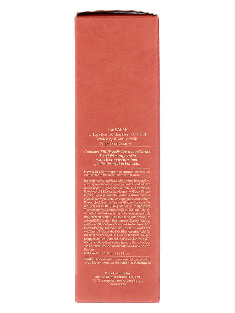 Изг-ль: THE SAEM INTERNATIONAL CO.LTD., КОРЕЯ, РЕСПУБЛИКА, 10F, 35, Cheonggyecheon-ro, Jongno-gu, Seoul. Осветляющий флюид с экстрактом перуанской золотой ягоды укрепляет кожу, создает защитный увлажняющий слой, который наполняет ее влагой и оберегает от воздействия внешней среды. Содержит керамиды и суперцентеллу, которые успокаивают чувствительную кожу и обеспечивает интенсивное увлажнение. Минимизирует возможность появления раздражений на коже, возвращая ей здоровый внешний вид и устраняя ощущение напряжения. Применение: нанести на кожу и дать впитаться легкими похлопывающими движениями.