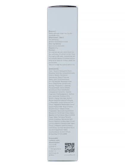 Изготовитель: You&Me Cosmetic, Корея, Республика, 7, Dangjeong-ro, Gunpo-si, Gyeonggi-do. Крем для век осветляющий способствует деликатному осветлению и выравниванию тона кожи вокруг глаз, улучшает обмен веществ в клетках и стимулирует синтез собственного коллагена. При постоянном применении средства кожа становится гладкой, светлой и глубоко увлажненной. Способ применения: нанести крем на очищенную и тонизированную кожу, легкими массирующими движениями распределить до полного впитывания.