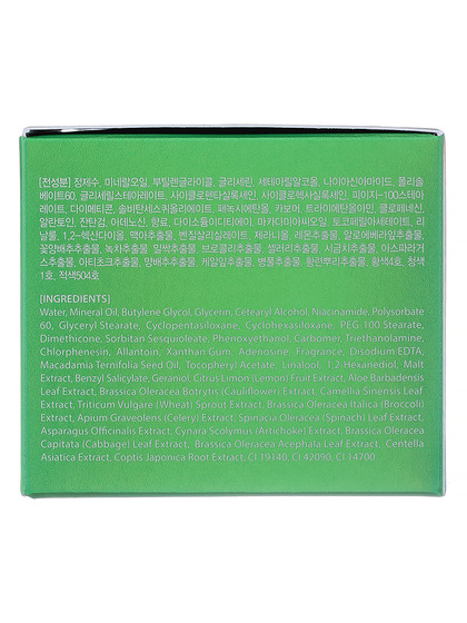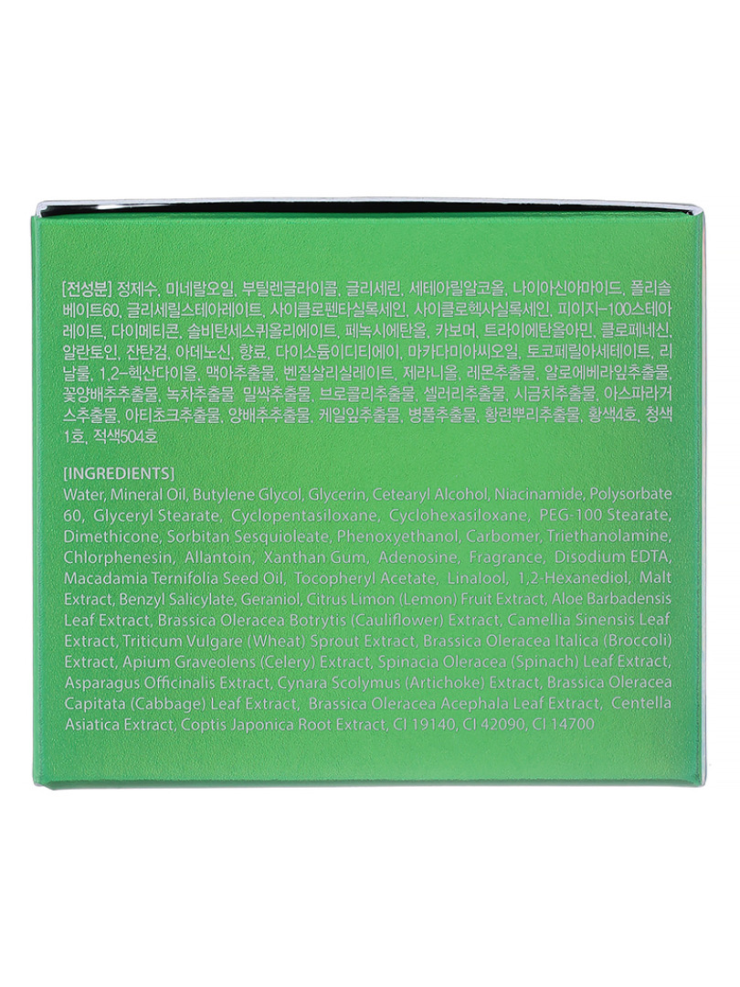 Water, Mineral Oil, Butylene Glycol, Glycerin, Cetearyl Alcohol, Niacinamide, Polysorbate 60, Glyceryl Stearate, Cyclopentasiloxane, Cyclohexasiloxane, PEG-100 Stearate, Dimethicone, Sorbitan Sesquioleate, Phenoxyethanol, Carbomer, Triethanolamine, Chlorphenesin, Allantoin, Xanthan Gum, Adenosine, Fragrance, Disodium EDTA, Macadamia Ternifolia Seed Oil, Tocopheryl Acetate, Linalool, 1,2-Hexanediol, Malt Extract, Benzyl Salicylate, Geraniol, Citrus Limon (Lemon) Fruit Extract, Aloe Barbadensis Leaf Extract, Brassica Oleracea Botrytis (Cauliflower) Extract, Camellia Sinensis Leaf Extract, Triticum Vulgare (Wheat) Sprout Extract, Brassica Oleracea Italica (Broccoli) Extract, Apium Graveolens (Celery) Extract, Spinacia Oleracea (Spinach) Leaf Extract, Asparagus Officinalis Extract, Cynara Scolymus (Artichoke) Extract, Brassica Oleracea Capitata (Cabbage) Leaf Extract, Brassica Oleracea Acephala Leaf Extract, Centella Asiatica Extract, Coptis Japonica Root Extract, CI 19140, CI 42090, CI 14700
