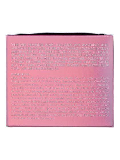 Water, Butylene Glycol, Glycerin, Niacinamide, Alcohol, Phenyl Trimethicone, PEG-60 Hydrogenated Castor Oil, Triethanolamine, Phenoxyethanol, Acrylates/C10-30 Alkyl Acrylate Crosspolymer, Carbomer, Chlorphenesin, Disodium EDTA, Fragrance, Adenosine, 1,2-Hexanediol, Octyldodecanol, Lactobacillus/Punica Granatum Fruit Ferment Extract, Hydrogenated Lecithin, Sodium Hyaluronate Ceramide NP, CI 17200, Solanum Lycopersicum (Tomato) Fruit Extract, Melaleuca Alternifolia (Tea Tree) Leaf Extract, Coptis Japonica Root Extract, Caprylyl Glycol, Rosa Damascena Flower Water, Brassica Oleracea Botrytis (Cauliflower) Extract, Camellia Sinensis Leaf Extract, Triticum Vulgare (Wheat) Sprout Extract, Brassica Oleracea Italica (Broccoli) Extract, Apium Graveolens (Celery) Extract, Spinacia Oleracea (Spinach) Leaf Extract, Asparagus Officinalis Extract, Cynara Scolymus (Artichoke) Extract, Brassica Oleracea Capitata (Cabbage) Leaf Extract, Brassica Oleracea Acephala Leaf Extract, Hydrolyzed Hyaluronic Acid, Sodium Acetylated Hyaluronate
