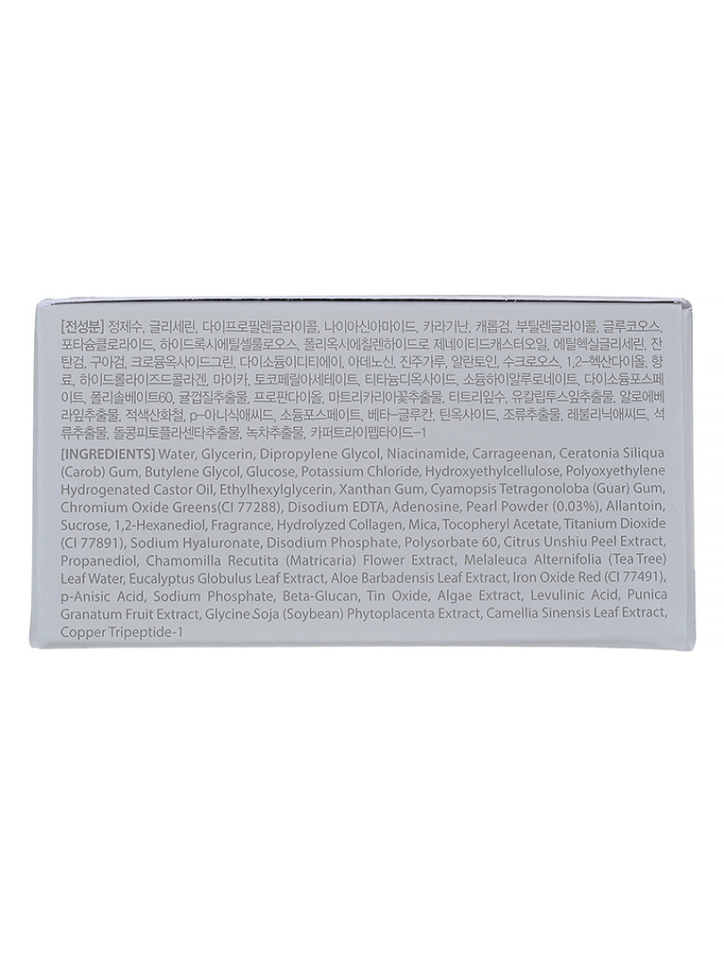 Water, Glycerin, Dipropylene Glycol, Niacinamide, Carrageenan, Ceratonia Siliqua (Carob) Gum, Butylene Glycol, Glucose, Potassium Chloride, Hydroxyethylcellulose, Polyoxyethylene Hydrogenated Castor Oil, Ethylhexylglycerin, Xanthan Gum, Cyamopsis Tetragonoloba (Guar) Gum, Chromium Oxide Greens(CI 77288), Disodium EDTA, Adenosine, Pearl Powder (0.03%), Allantoin, Sucrose, 1,2-Hexanediol, Fragrance, Hydrolyzed Collagen, Mica, Tocopheryl Acetate, Titanium Dioxide (CI 77891), Sodium Hyaluronate, Disodium Phosphate, Polysorbate 60, Citrus Unshiu Peel Extract, Propanediol, Chamomilla Recutita (Matricaria) Flower Extract, Melaleuca Alternifolia (Tea Tree) Leaf Water, Eucalyptus Globulus Leaf Extract, Aloe Barbadensis Leaf Extract, Iron Oxide Red (CI 77491), p-Anisic Acid, Sodium Phosphate, Beta-Glucan, Tin Oxide, Algae Extract, Levulinic Acid, Punica Granatum Fruit Extract, Glycine Soja (Soybean) Phytoplacenta Extract, Camellia Sinensis Leaf Extract, Copper Tripeptide-1