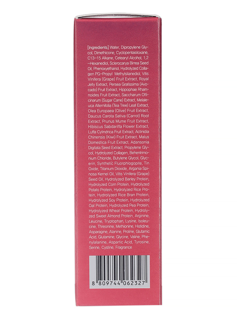 Water, Dipropylene Glycol, Dimethicone, Cyclopentasiloxane, C13-15 Alkane, Cetearyl Alcohol, 1,2-Hexanediol, Sclerocarya Birrea Seed Oil, Phenoxyethanol, Hydrolyzed Collagen PG-Propyl Methylsilanediol, Vitis Vinifera (Grape) Fruit Extract, Royal Jelly Extract, Persea Gratissima (Avocado) Fruit Extract, Hippophae Rhamnoides Fruit Extract, Saccharum Officinarum (Sugar Cane) Extract, Melaleuca Alternifolia (Tea Tree) Leaf Extract, Olea Europaea (Olive) Fruit Extract, Daucus Carota Sativa (Carrot) Root Extract, Prunus Mume Fruit Extract, Hibiscus Sabdariffa Flower Extract, Luffa Cylindrica Fruit Extract, Actinidia Chinensis (Kiwi) Fruit Extract, Malus Domestica Fruit Extract, Adansonia Digitata Seed Extract, Propylene Glycol, Hydrolyzed Collagen, Behentrimonium Chloride, Butylene Glycol, Glycerin, Synthetic Fluorphlogopite, Titanium Dioxide, Tin Oxide, Argania Spinosa Kernel Oil, Vitis Vinifera (Grape) Seed Oil, Hydrolyzed Wheat Protein, Hydrolyzed Sweet Almond Protein, Hydrolyzed Soy Protein, Hydrolyzed Rice Protein, Hydrolyzed Rice Bran Protein, Hydrolyzed Potato Protein, Hydrolyzed Pea Protein, Hydrolyzed Oat Protein, Hydrolyzed Corn Protein, Hydrolyzed Barley Protein, Valine, Tyrosine, Tryptophan, Threonine, Serine, Proline, Phenylalanine, Methionine, Lysine, Leucine, Isoleucine, Histidine, Glycine