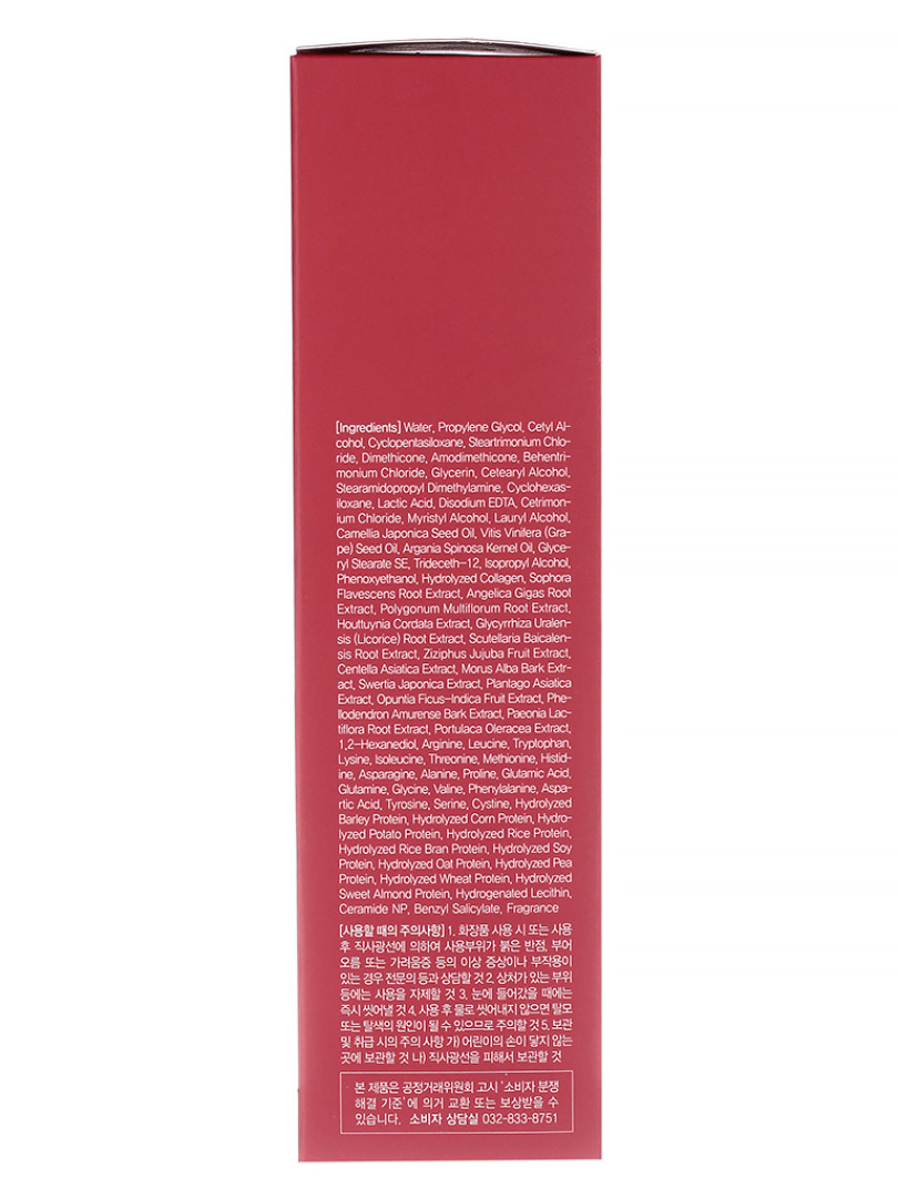 Water, Propylene Glycol, Cetyl Alcohol, Cyclopentasiloxane, Dimethicone, Cyclohexasiloxane, Steartrimonium Chloride, Amodimethicone, Cetrimonium Chloride, Trideceth-12, Behentrimonium Chloride, Glycerin, Cetearyl Alcohol, Stearamidopropyl Dimethylamine, Lactic Acid, Disodium EDTA, Myristyl Alcohol, Lauryl Alcohol, Camellia Japonica Seed Oil, Vitis Vinifera (Grape) Seed Oil, Argania Spinosa Kernel Oil, Glyceryl Stearate SE, Isopropyl Alcohol, Phenoxyethanol, Hydrolyzed Collagen, Sophora Flavescens Root Extract, Angelica Gigas Root Extract, Polygonum Multiflorum Root Extract, Houttuynia Cordata Extract, Glycyrrhiza Uralensis (Licorice) Root Extract, Scutellaria Baicalensis Root Extract, Ziziphus Jujuba Fruit Extract, Centella Asiatica Extract, Morus Alba Bark Extract, Swertia Japonica Extract, Plantago Asiatica Extract, Opuntia Ficus-Indica Fruit Extract, Phellodendron Amurense Bark Extract, Paeonia Lactiflora Root Extract, Portulaca Oleracea Extract, 1,2-Hexanediol, Arginine, Leucine, Tryptophan, Lysine, Isoleucine, Threonine, Methionine, Histidine, Asparagine, Alanine, Proline, Glutamic Acid, Glutamine, Glycine, Valine, Phenylalanine, Aspartic Acid, Tyrosine, Serine, Cystine, Hydrolyzed Barley Protein, Hydrolyzed Corn Protein, Hydrolyzed Potato Protein, Hydrolyzed Rice Protein, Hydrolyzed Rice Bran Protein, Hydrolyzed Soy Protein, Hydrolyzed Oat Protein, Hydrolyzed Pea Protein, Hydrolyzed Wheat Protein, Hydrolyzed Sweet Almond Protein, Hydrogenated Lecithin, Ceramide NP, Fragrance (Benzyl Salicylate)