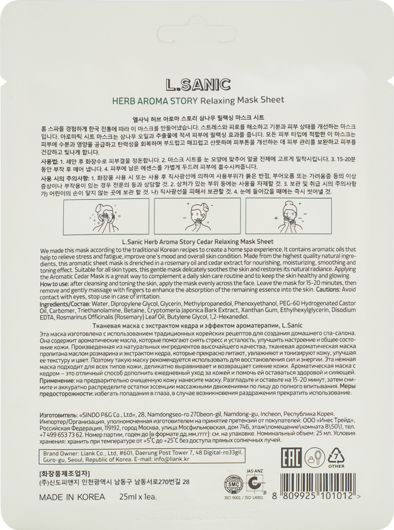 LSN Маска тканевая с экстрактом кедра и эффектом ароматерапии, 25мл, L.Sanic